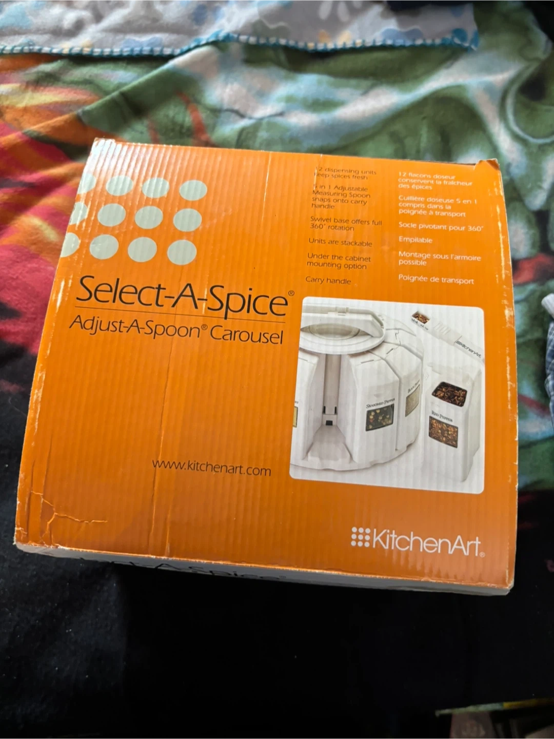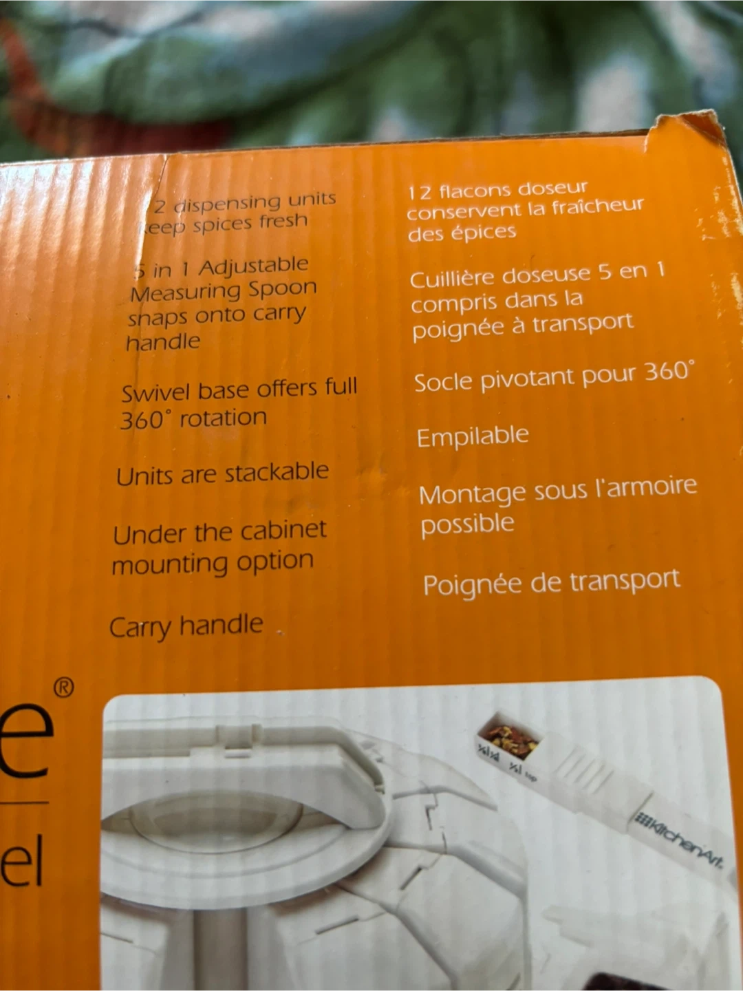 This Select-A-Spice carousel holds 12 spice dispensers and keeps them fresh. It has a swivel base offering full 360-degree rotation and units are stackable. Under the cabinet mounting option is included with a carry handle. It comes with 5 in 1 adjustable measuring spoons shaped onto the carry handle.