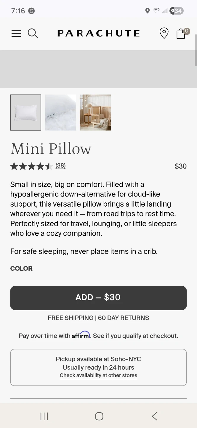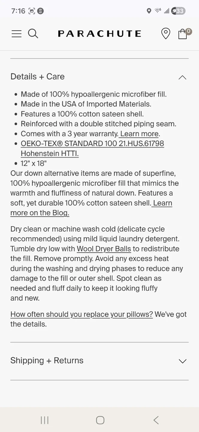 This is a Parachute Down Alternative Toddler Pillow. It's filled with a hypoallergenic microfiber fill and has a 100% cotton sateen shell. The pillow measures 12" x 18".