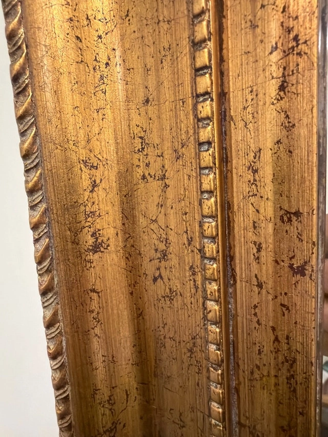 Beautiful large wall mirror with an ornate gold frame, perfect as a statement piece above a sofa, console table, or in an entryway. The mirror provides a bright, clear reflection and helps make any room feel more spacious and elegant. Frame has a classic, antique-inspired design with detailed corners and a warm gold finish that pairs well with neutral or modern décor. In excellent used condition: no cracks or chips in the glass; only minor wear on the frame from light use. Ideal for living rooms, dining rooms, bedrooms, or hallways; can be hung vertically and is quite substantial. Open to offers