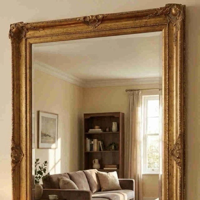 Beautiful large wall mirror with an ornate gold frame, perfect as a statement piece above a sofa, console table, or in an entryway. The mirror provides a bright, clear reflection and helps make any room feel more spacious and elegant. Frame has a classic, antique-inspired design with detailed corners and a warm gold finish that pairs well with neutral or modern décor. In excellent used condition: no cracks or chips in the glass; only minor wear on the frame from light use. Ideal for living rooms, dining rooms, bedrooms, or hallways; can be hung vertically and is quite substantial. Open to offers