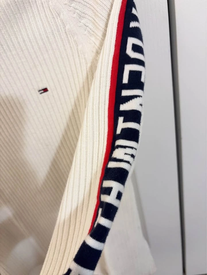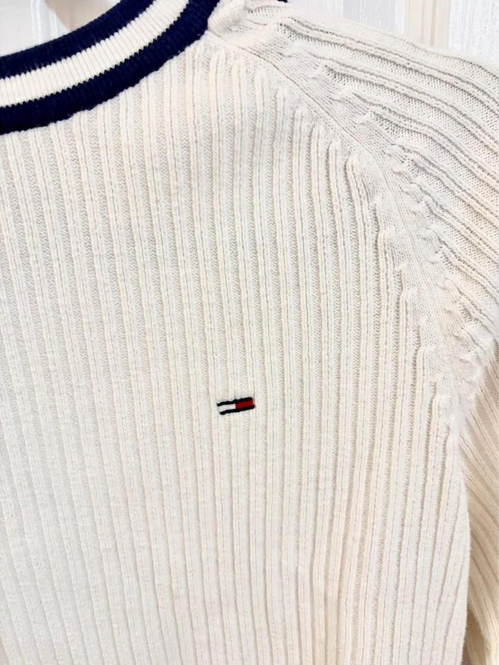 Stylish Tommy Hilfiger Denim ribbed long-sleeve sweater. It has a crisp white color with a navy and white striped crew neck collar. Features a small Tommy Hilfiger flag logo on the chest. The sleeves have a cool red and navy stripe with 'HILFIGER DENIM' text. Size is Small (S/P).