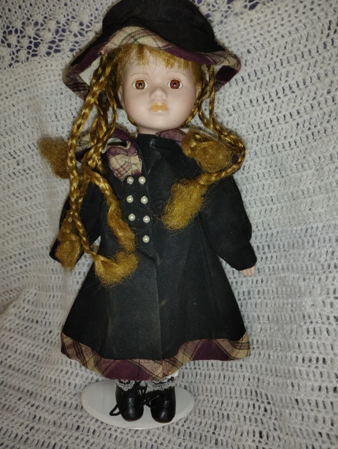 This vintage porcelain doll is Boyds Collection "Yesterday's Child" series, often identified as the "Kayla" model. dressed in a black coat with plaid trim and a matching hat. She has long blonde braided hair and delicate facial features. The doll stands on a white display base.