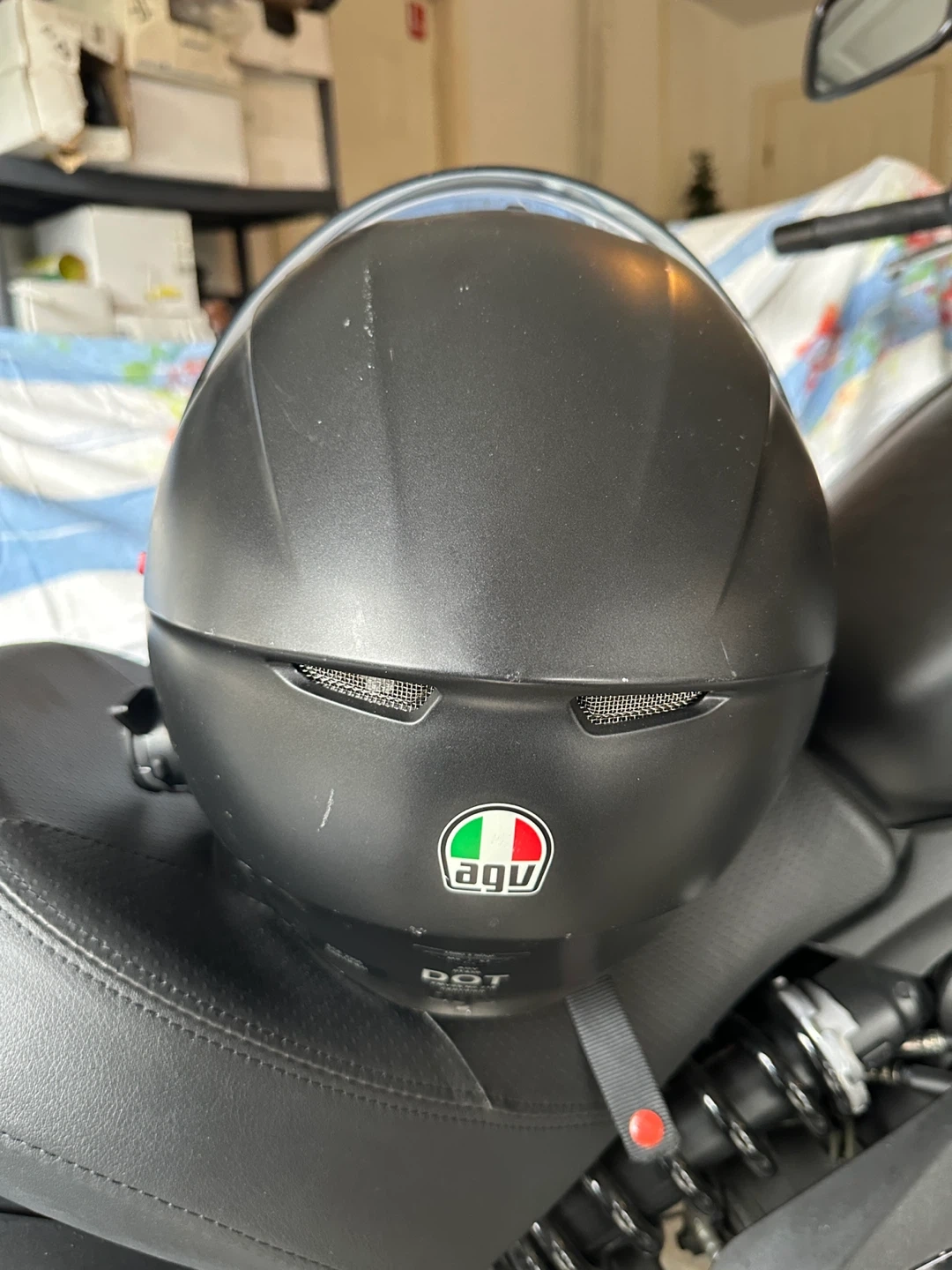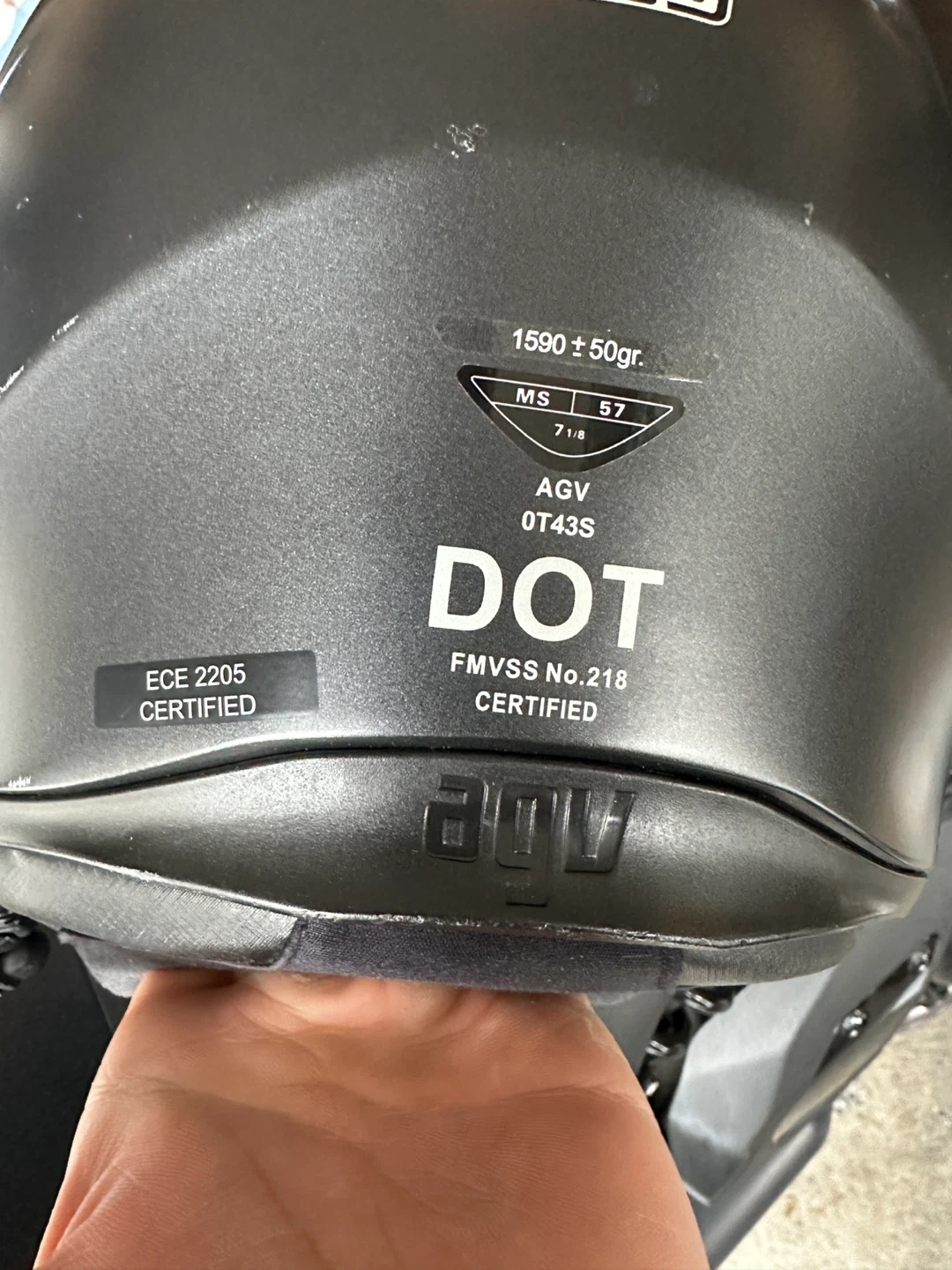 Selling an AGV motorcycle helmet in size MS (57). It has a sleek black design and appears to be in good condition. The helmet is DOT and ECE 2205 certified for safety. Feel free to reach out if you have any questions!