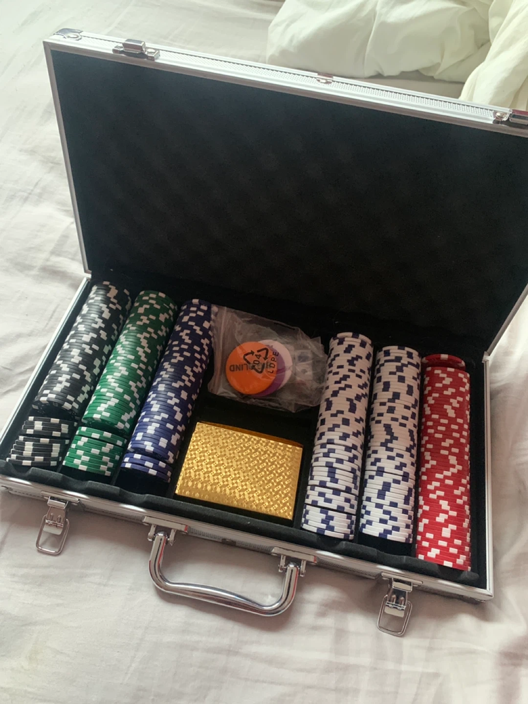This is a poker chip set in a silver case. It includes various coloured chips and a gold card holder. These chips are great for game nights with friends!