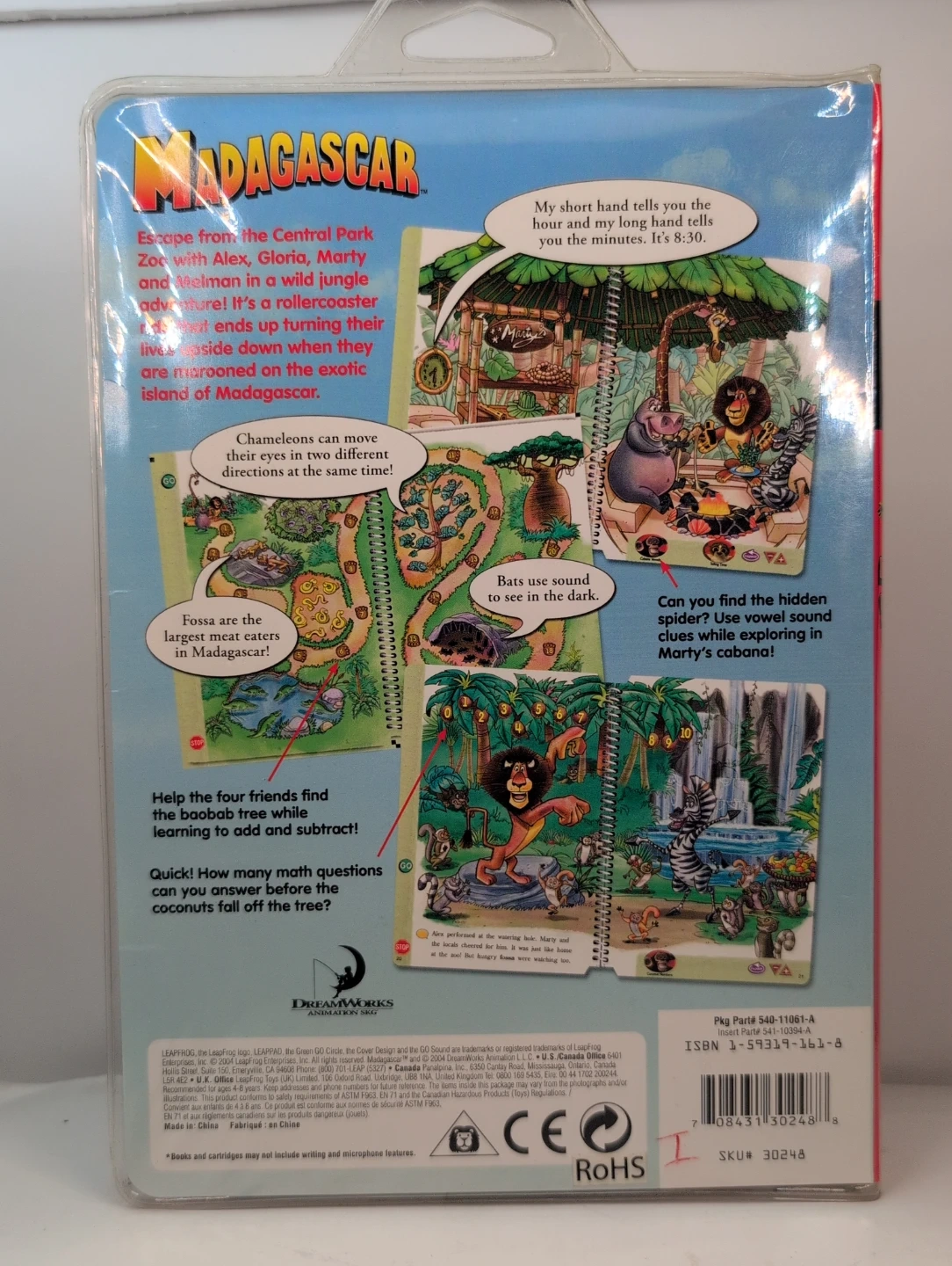 This LeapPad interactive book and cartridge features the Madagascar characters. It teaches African animal facts, "hello" and "goodbye" in 9 languages, short and long vowels, spelling, parts of speech, addition, subtraction, and geometry. Recommended for ages 4-8.