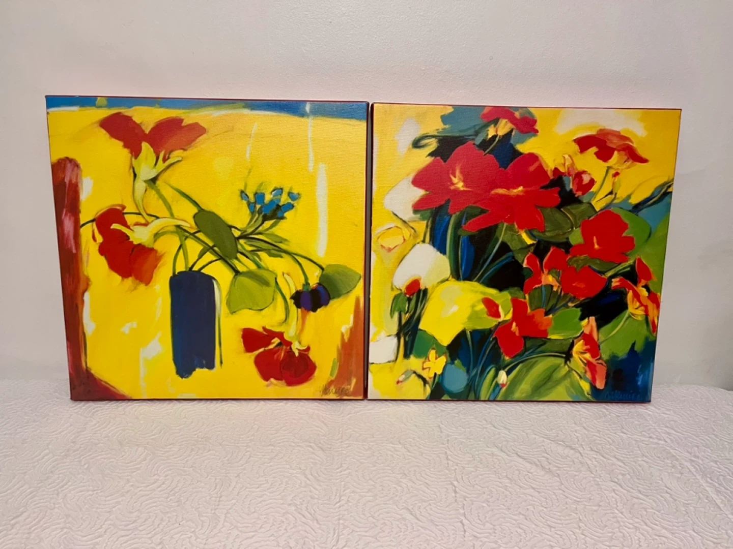 This is a set of two vibrant acrylic paintings on canvas, depicting colourful floral arrangements. Each canvas measures approximately 12x16 inches. They're bright and cheerful pieces that would add a pop of colour to any room. These would be great for someone looking to brighten up their living space or office.