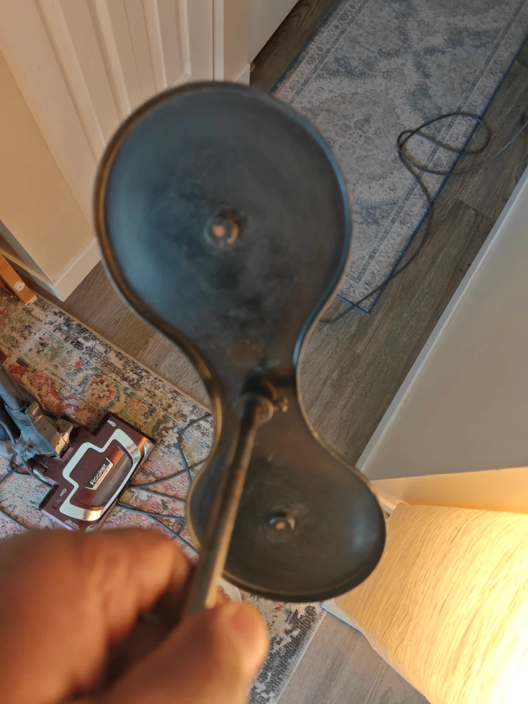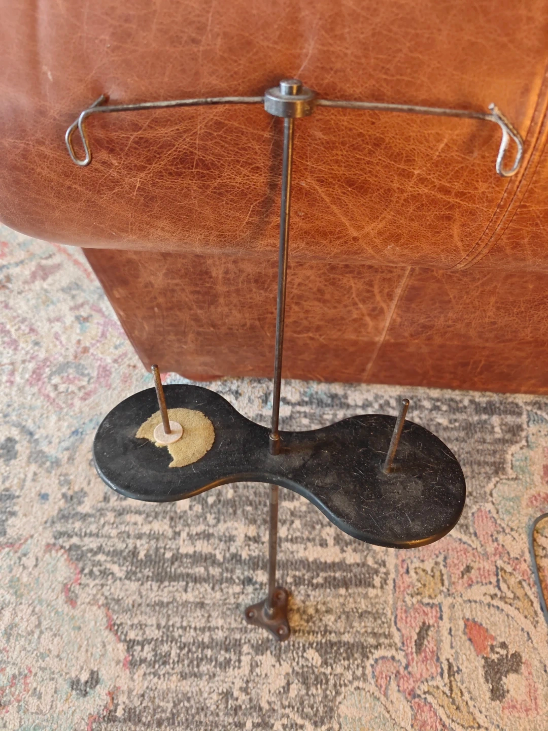 This is a vintage caddy tray designed to attach to the side of a chair or sofa. It features a metal stand with a double-tiered black tray. The tray has two prongs, one of which holds a small sander pad. The frame includes hooks for attaching to furniture. It's perfect for keeping small items like remote controls or knitting supplies handy!