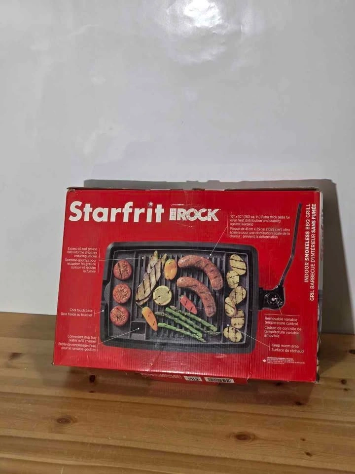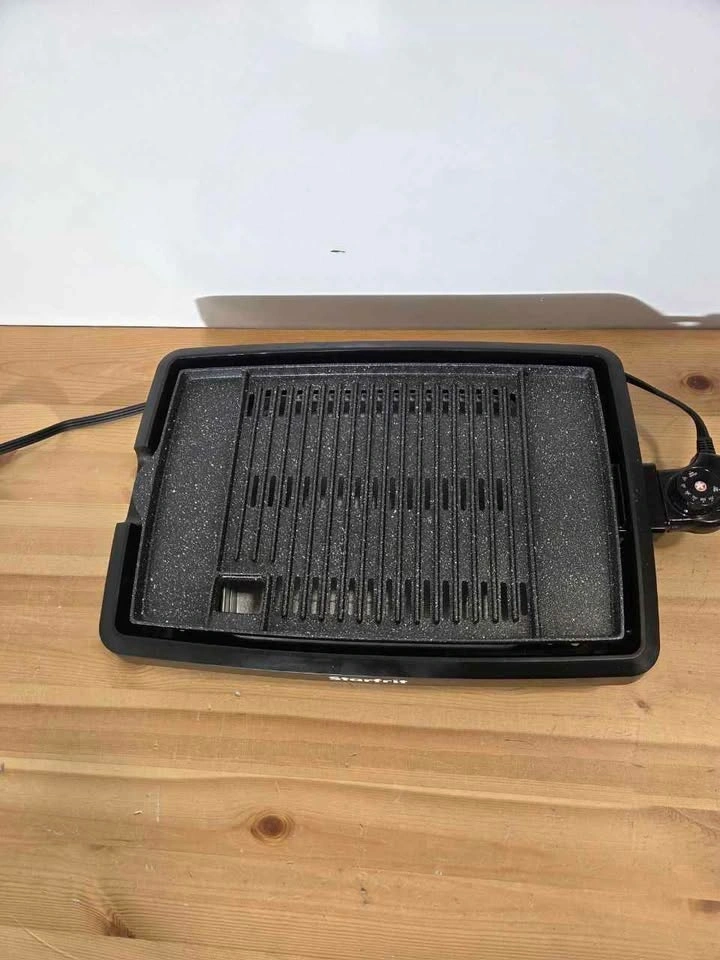 Used. Smokeless design ideal for indoor grilling anytime. Non-stick cooking surface for easy cleanup. Adjustable temperature control for perfect cooking results. Large 10" x 16" surface fits multiple items at once. Great for apartments, balconies, or home use.