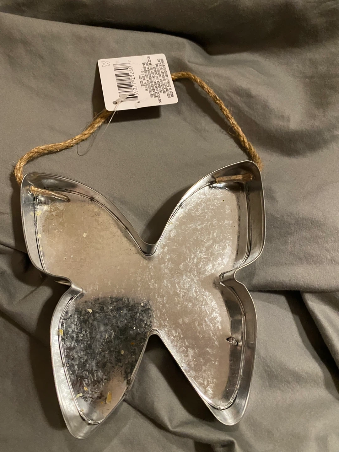 Set of metal cookie cutters in various shapes including hearts and butterflies. Includes twine for hanging. Great for crafting or baking projects!