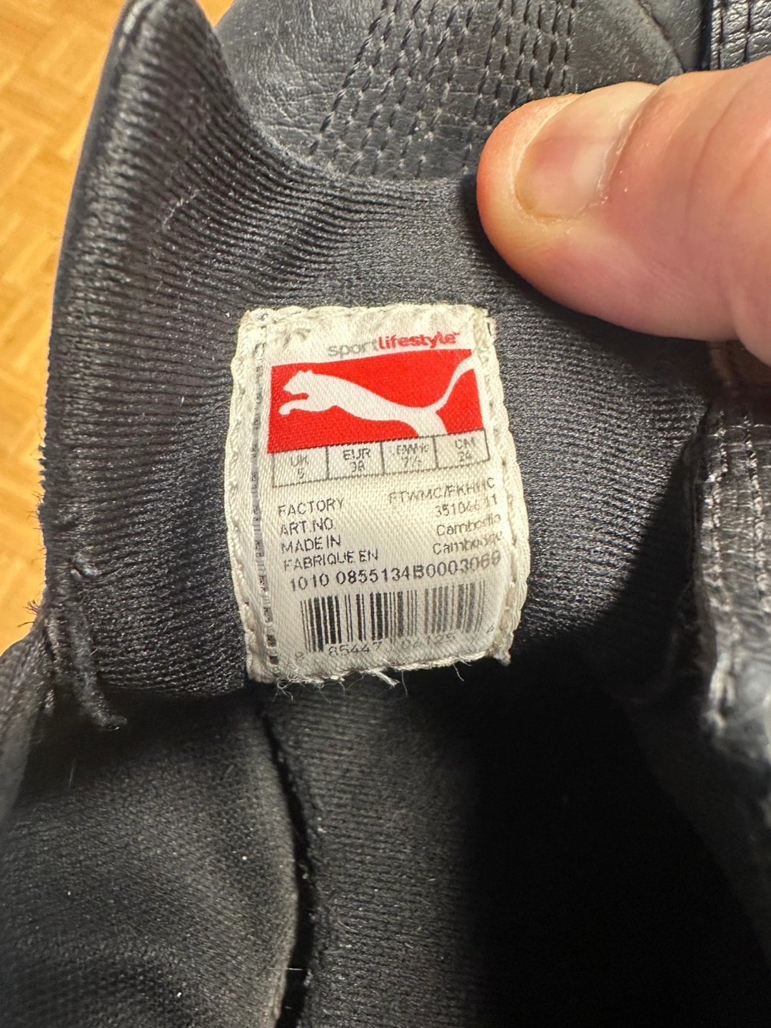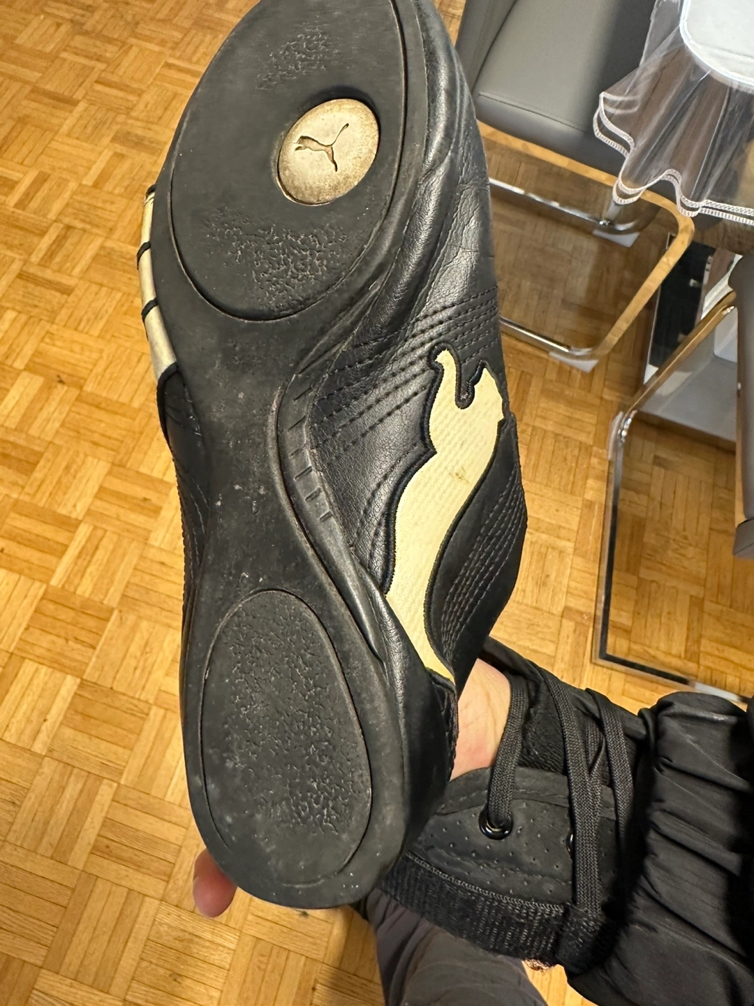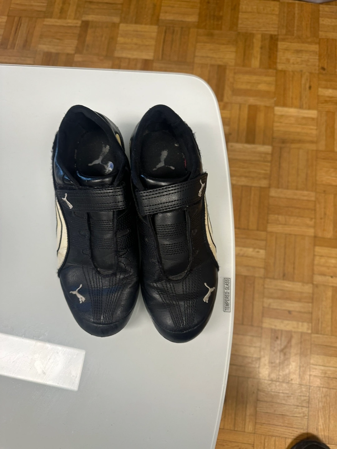 Pre-owned Puma Sportlifestyle shoes. Black leather. Velcro closure. Some wear. Good condition.