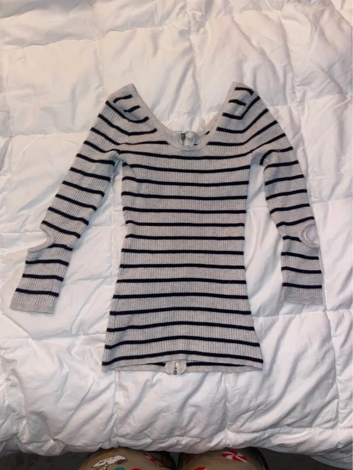 Stylish Guess ribbed knit top in size XS. The material is quite stretchy and could likely also fit a size S. Features grey and black stripes, a full zipper front, and cool cut-out details on the sleeves. It has a wider neckline and is super comfy.