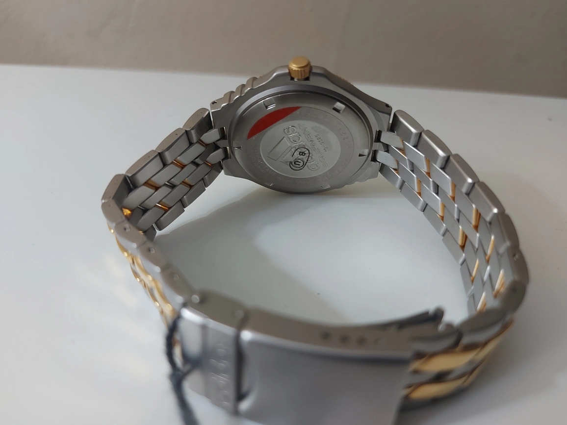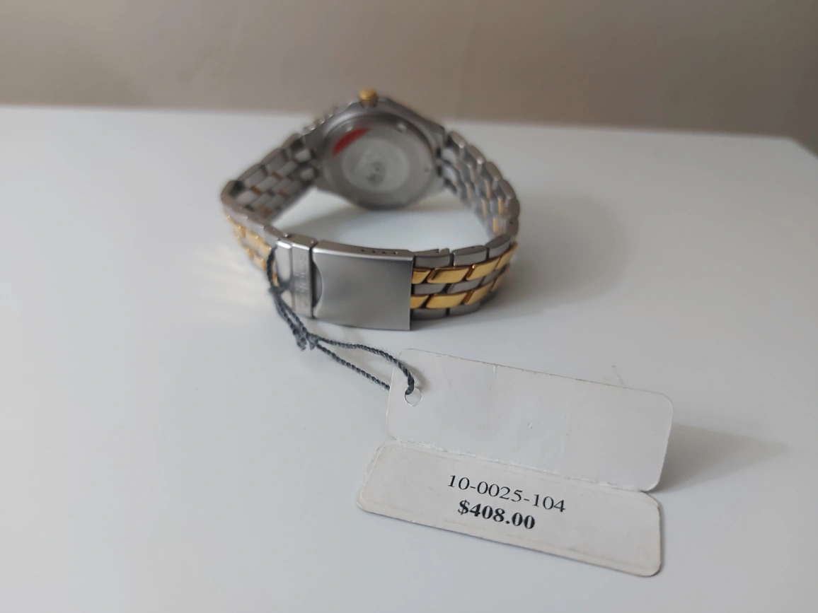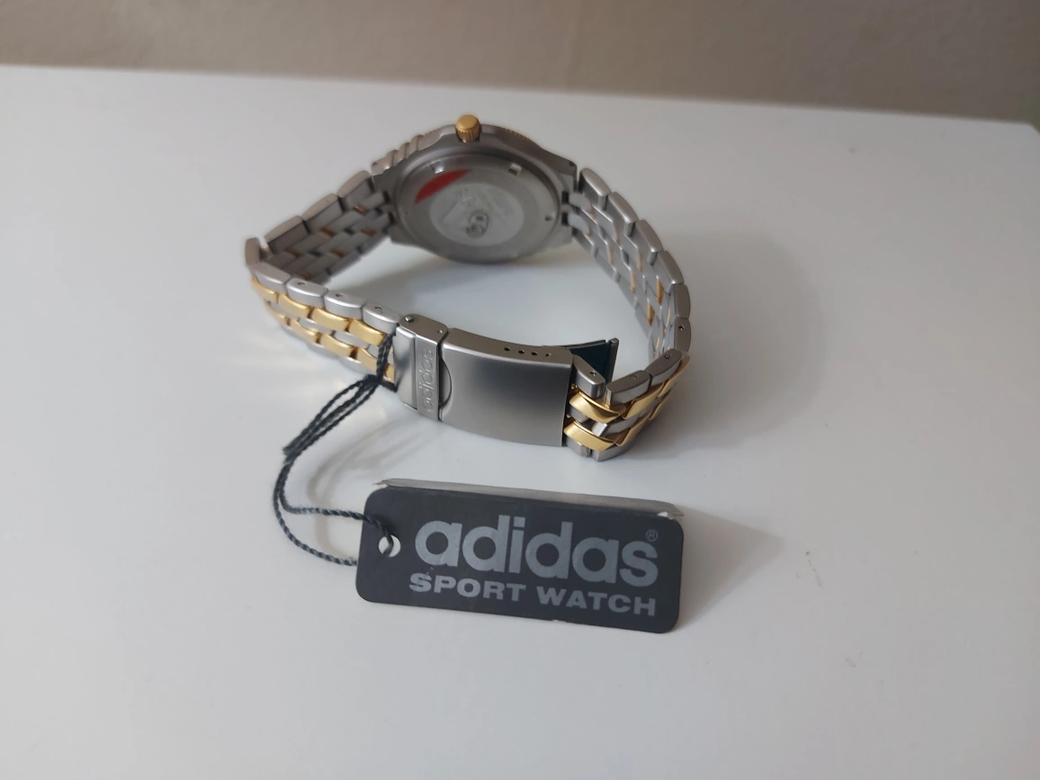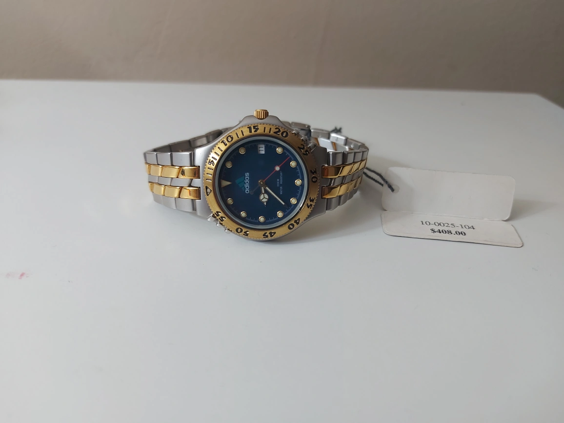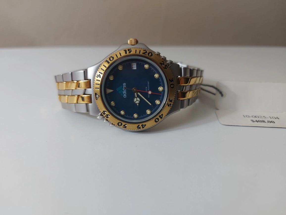 This is an Adidas watch with a two tone metal band. It has a blue face with gold accents. The watch has a date window. It is new and has not been worn.boxed missed