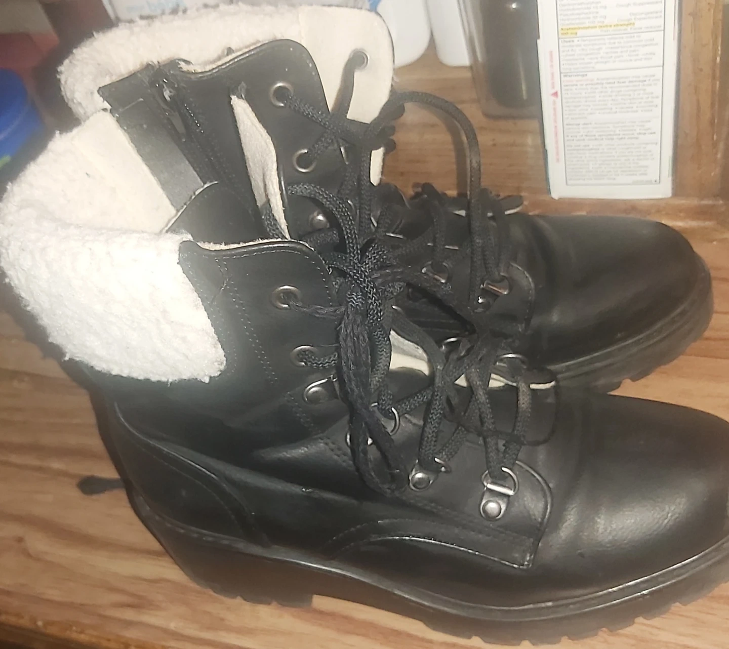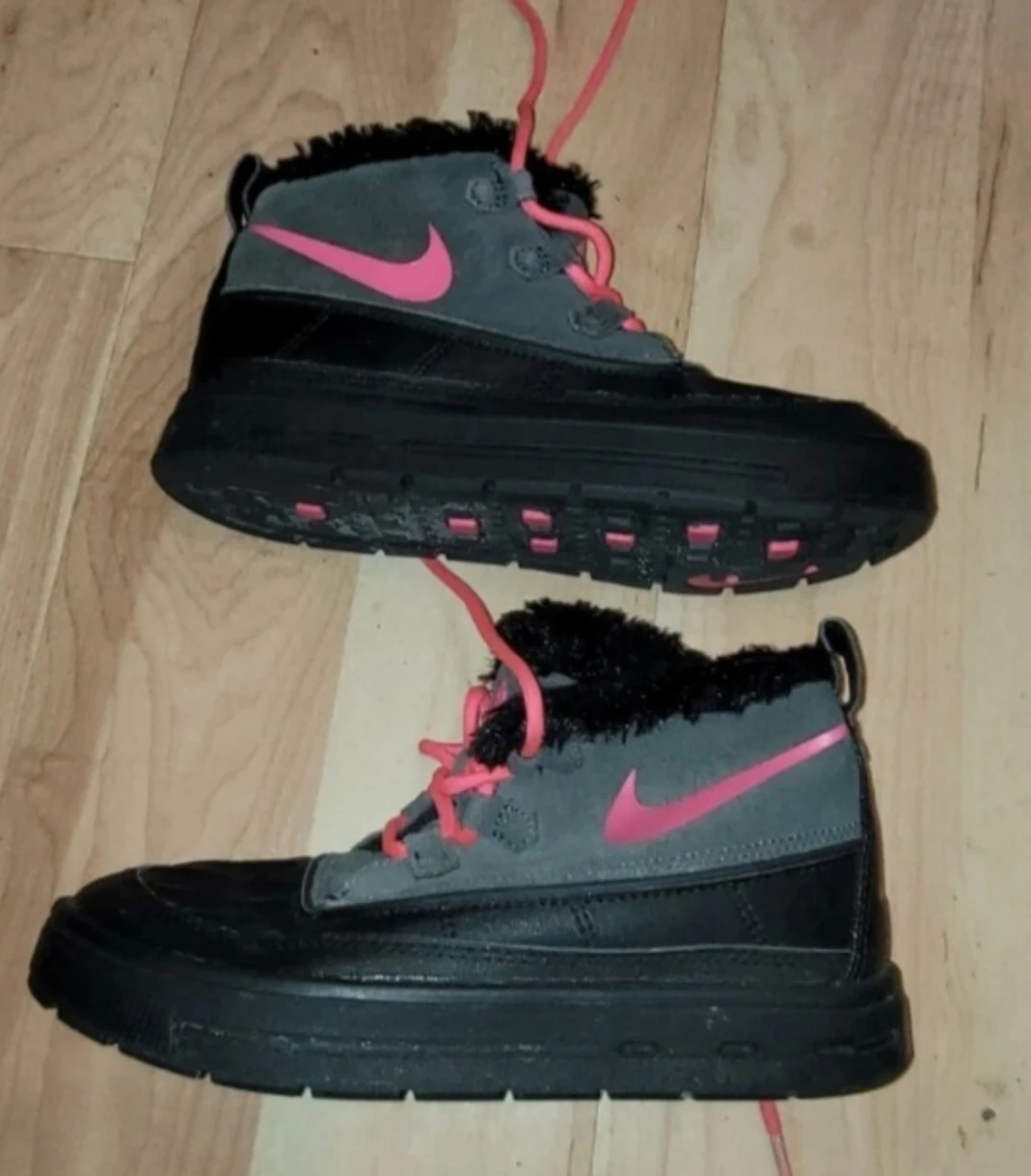 Cozy black and grey Nike winter boots for kids with a pink swoosh and fur lining. They're great for keeping little feet warm in colder weather. Made with durable materials for active use.