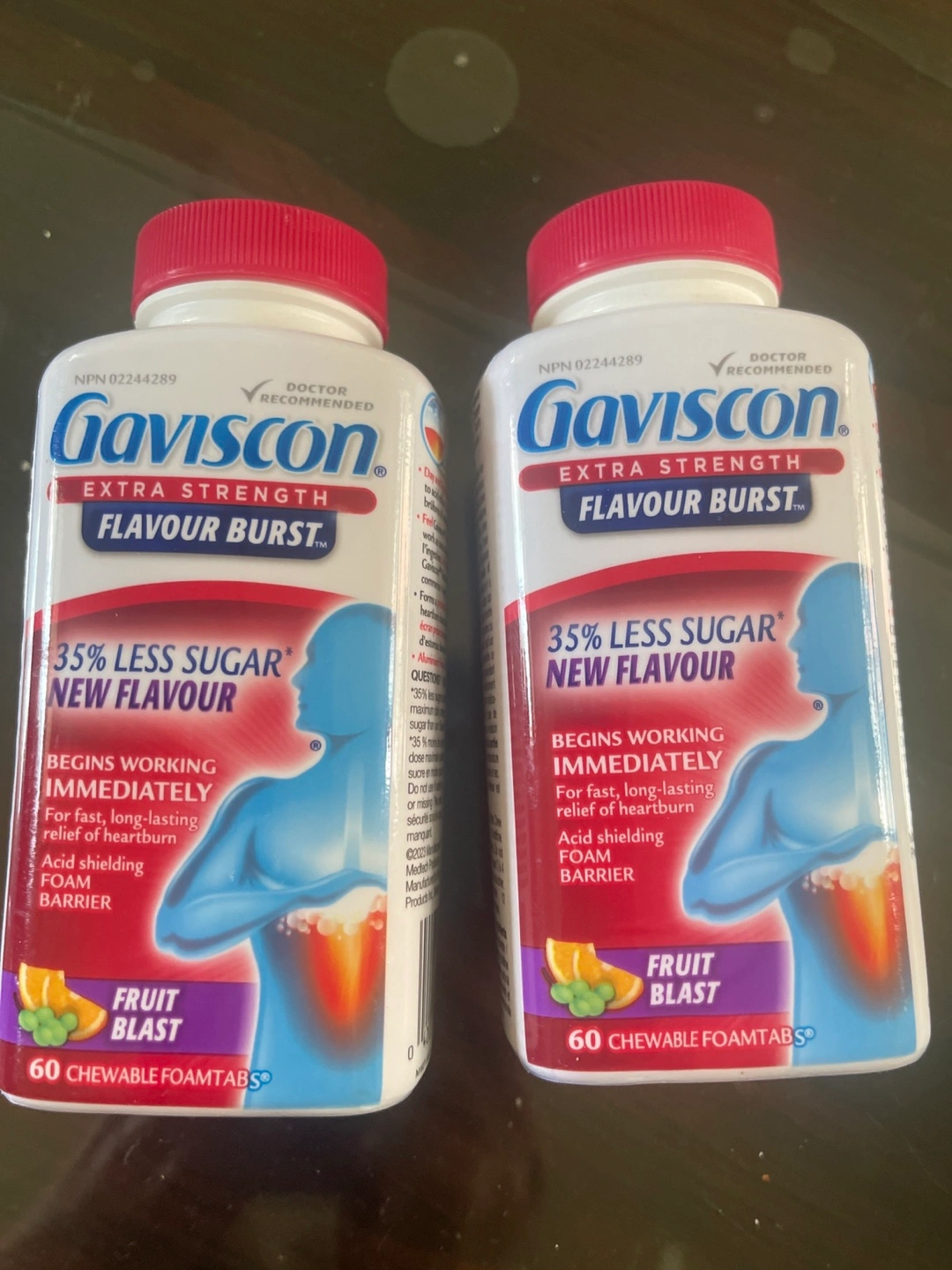 Selling two bottles of Gaviscon Extra Strength Fruit Blast chewable tablets. They're great for fast, long-lasting relief of heartburn and provide an acid shielding foam barrier. Each bottle contains 60 chewable foamtabs. Expiry date is May 2026
