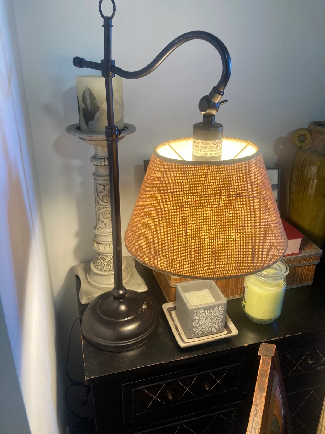 This is a metal desk lamp with a woven lampshade. It's a classic design that's great for any workspace or bedside table. It has a flexible arm for adjustable lighting. Its dark bronze finish complements most decor styles.