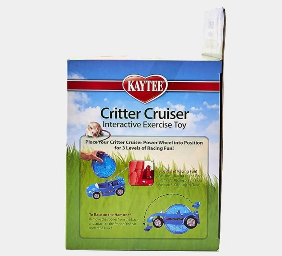 Critter Cruiser is an exciting pet powered exercise car for hamsters and gerbils. Critter Cruiser's adjustable racing wheel allows for the car to work in three different ways! First, when the Comfort Wheel is in the top position, exercising critters spin the Wheel and the Critter Cruiser remains stationary. Interactive fun begins by adjusting the Comfort Wheel into the middle position. In the middle position, you can watch your pet "drive" their Critter Cruiser across any flat surface. By adjusting the Comfort Wheel to the lowest position, the Critter Cruiser will work directly on Kaytee's Hamtrac.