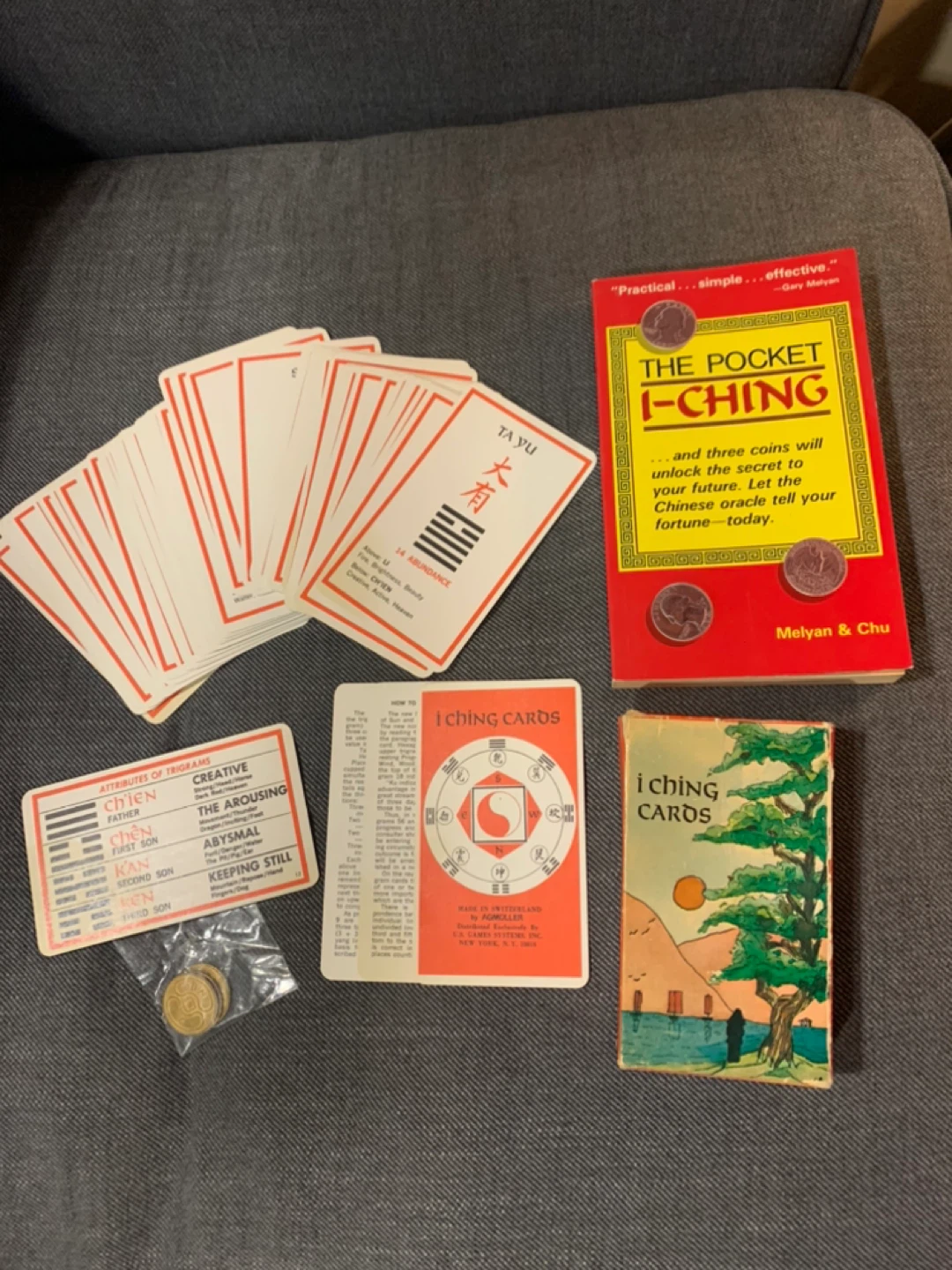 Selling a complete set of The Pocket I-Ching, including the cards, book, and coins. It's a fascinating tool for divination and self-reflection. The set is in good condition and ready for a new owner to explore its wisdom. Bought the n the 80’s at The ROM. Bought the Book separately. All cards are in impeccable condition, as is the book. Originally box a little scuffed from being in a truck all these years. Made in Switzerland. Book from Singapore!