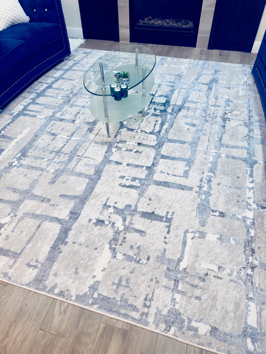 This modern abstract rug features a distressed geometric pattern in shades of grey and cream. It's a medium-sized rug that will complement many decor styles. This rug is suitable for high-traffic areas.