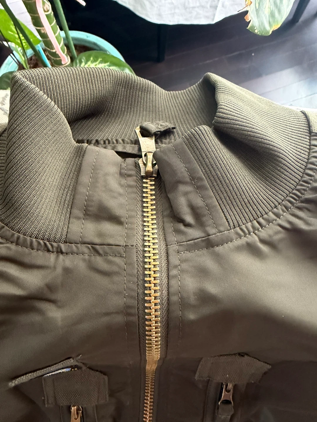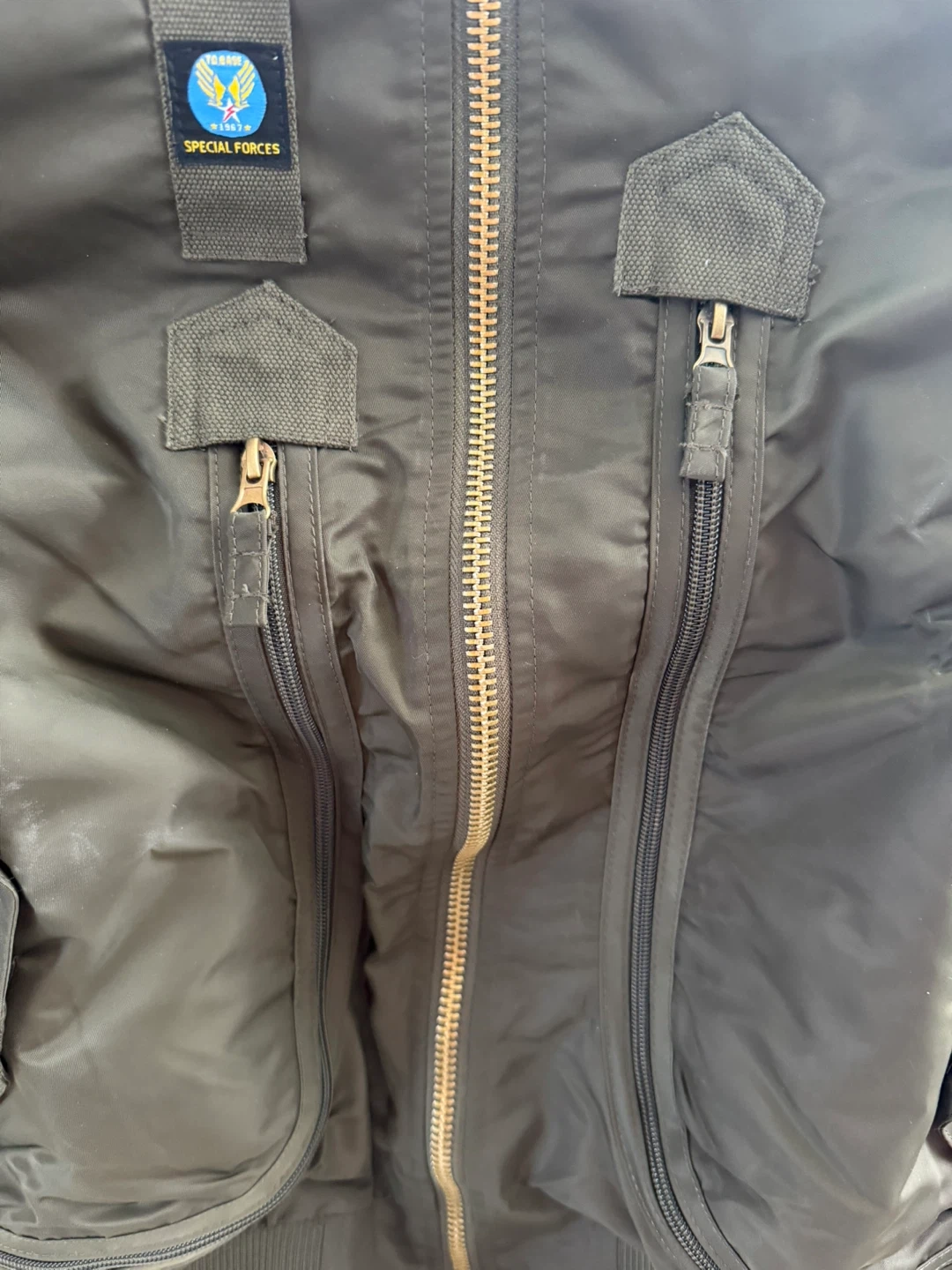 This olive green bomber jacket features a distinctive Special Forces patch and a full zip-up front. It's made from a durable nylon-like material. Multiple zippered pockets and elasticized cuffs offer practicality.