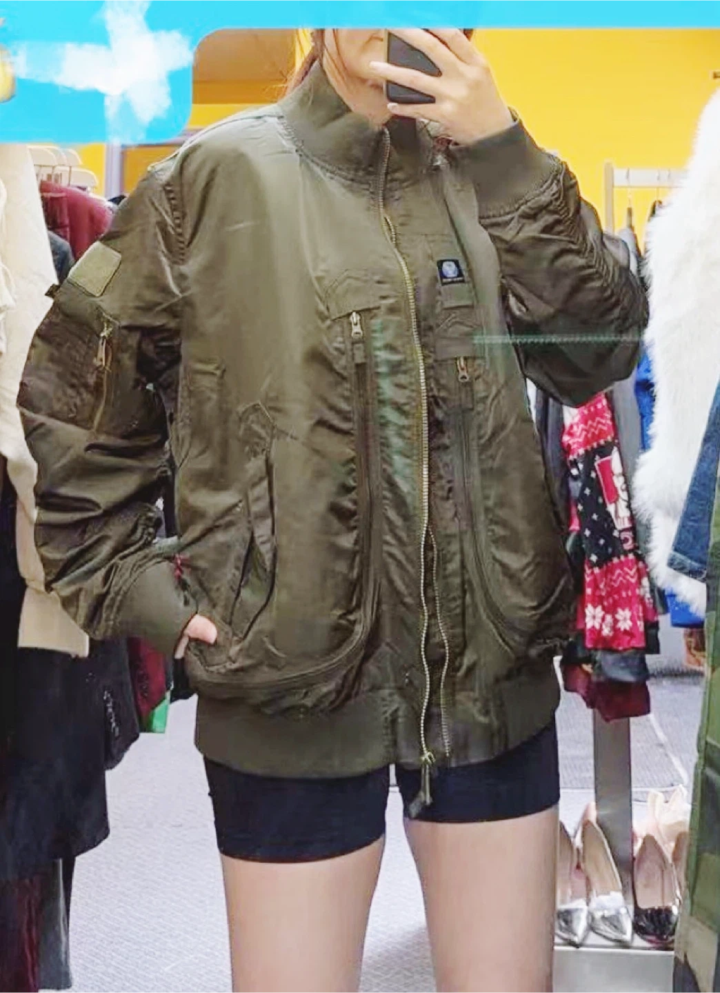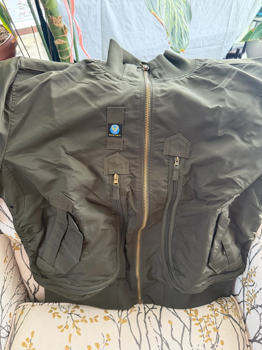 This olive green bomber jacket features a distinctive Special Forces patch and a full zip-up front. It's made from a durable nylon-like material. Multiple zippered pockets and elasticized cuffs offer practicality.