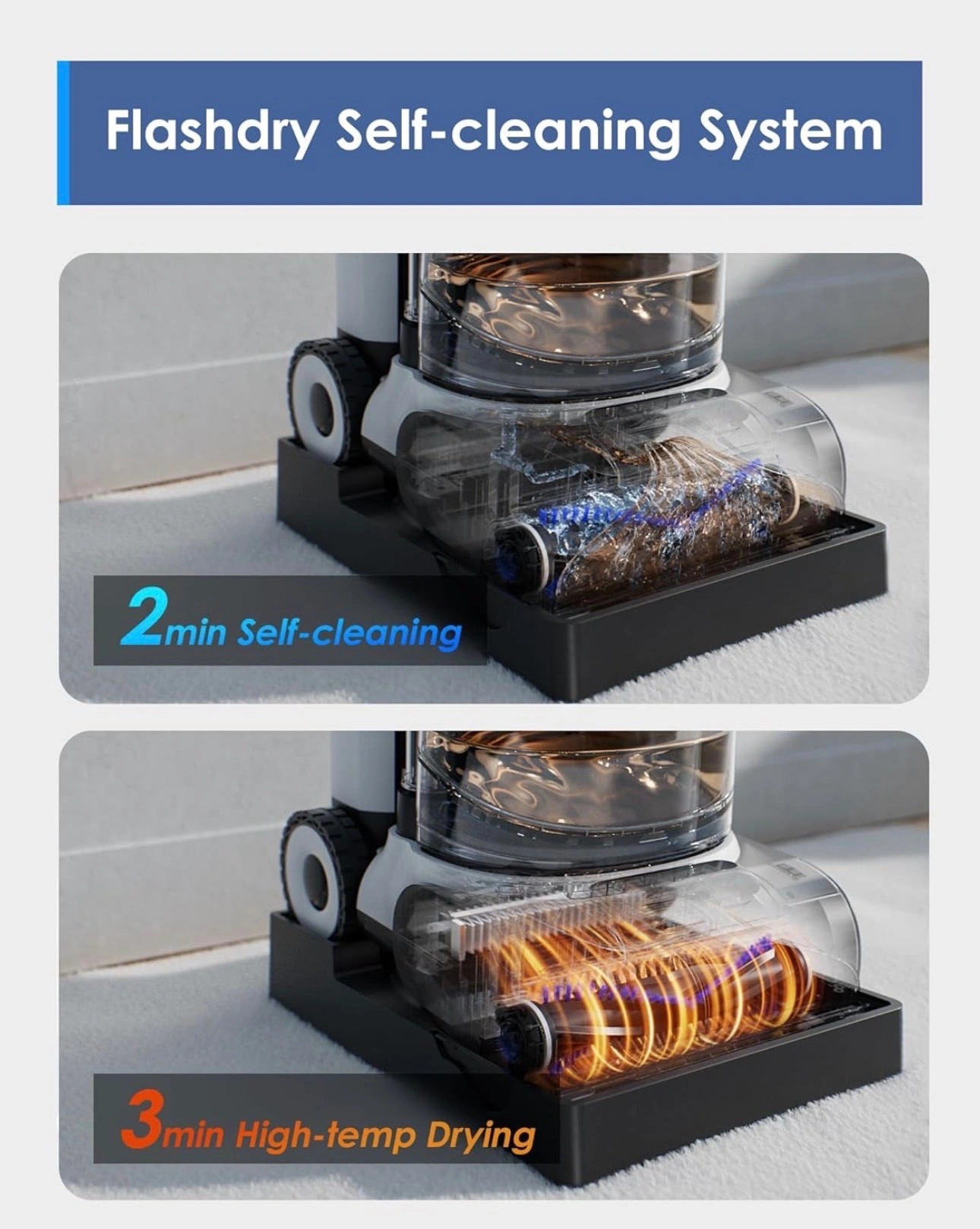 FlashDry Self-cleaning System: Deep cleans the brush roller, suction inlet, and brush roller cover with just one press. Then the brush is completely dried with 131℉ heated air, ensuring worry-free operation after use.