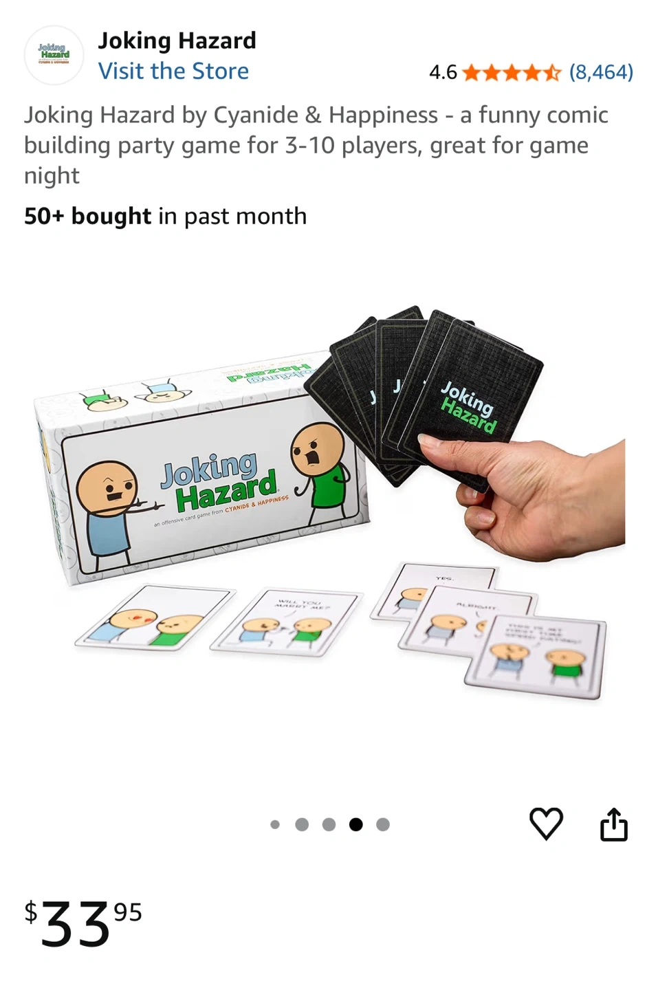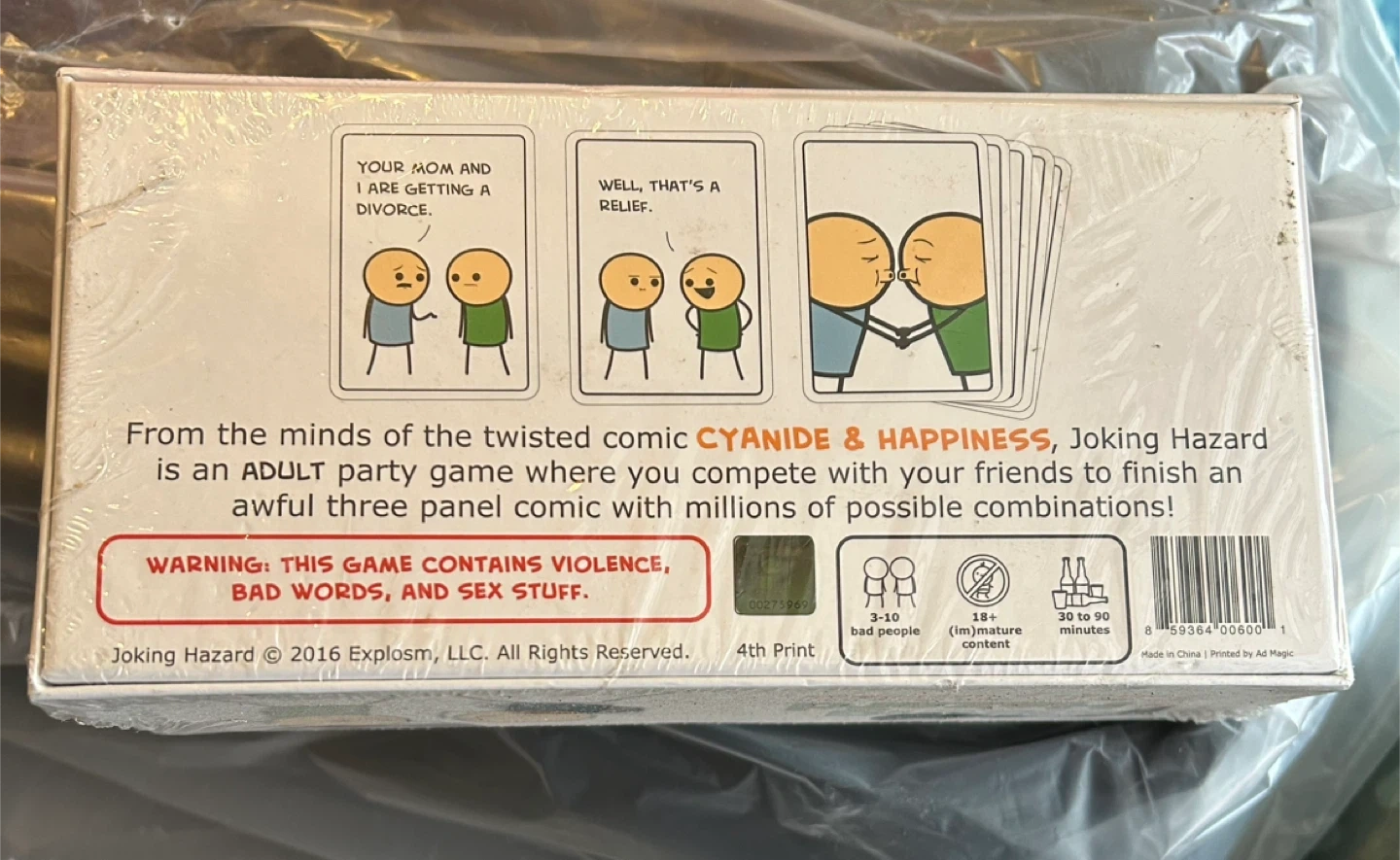 Selling a Joking Hazard adult party game by Cyanide & Happiness. It's a hilarious and twisted game where you compete with your friends to finish an awful three-panel comic. Perfect for game night with 3-10 players, ages 18+ (mature content). Brand New, sealed