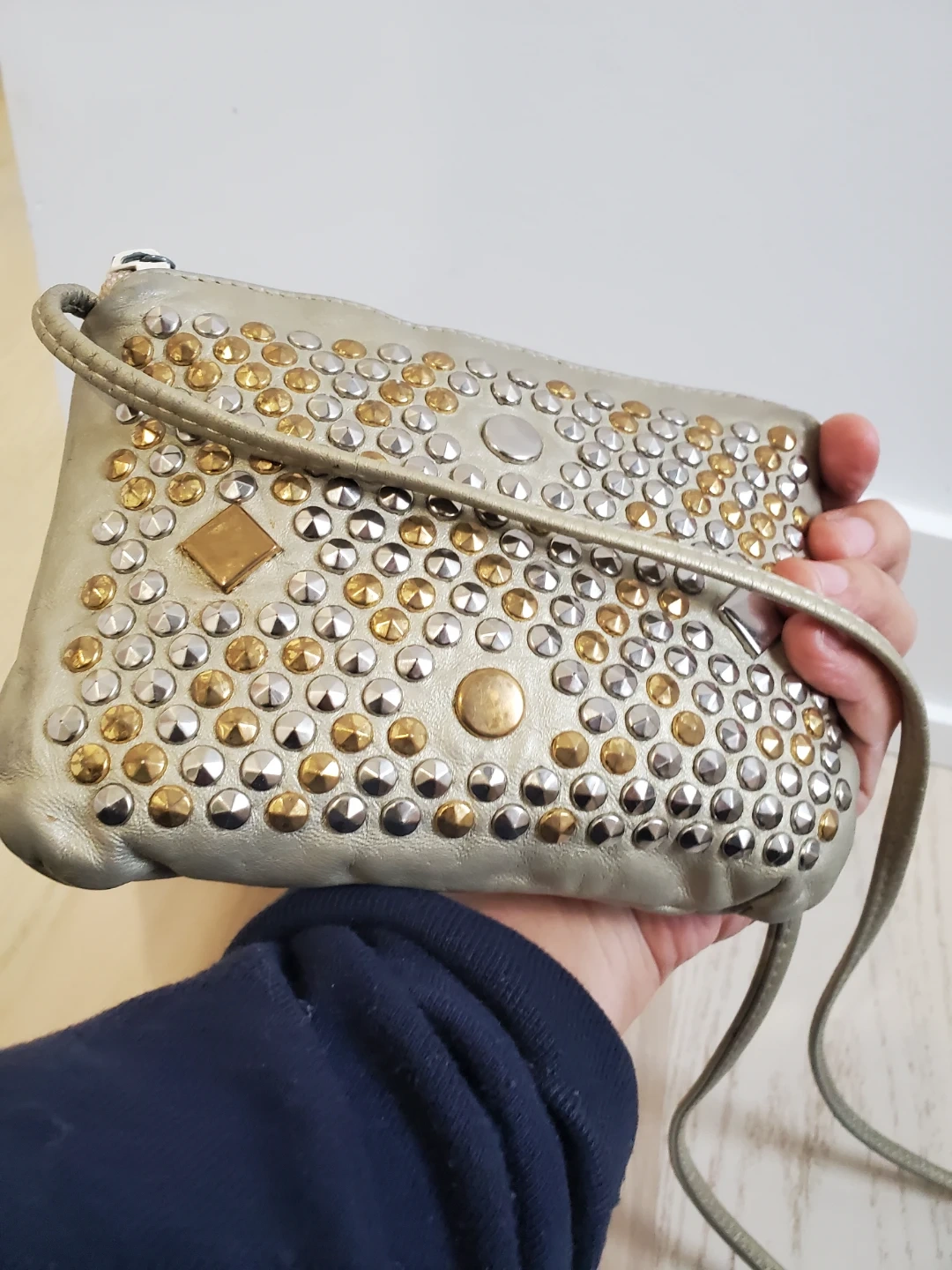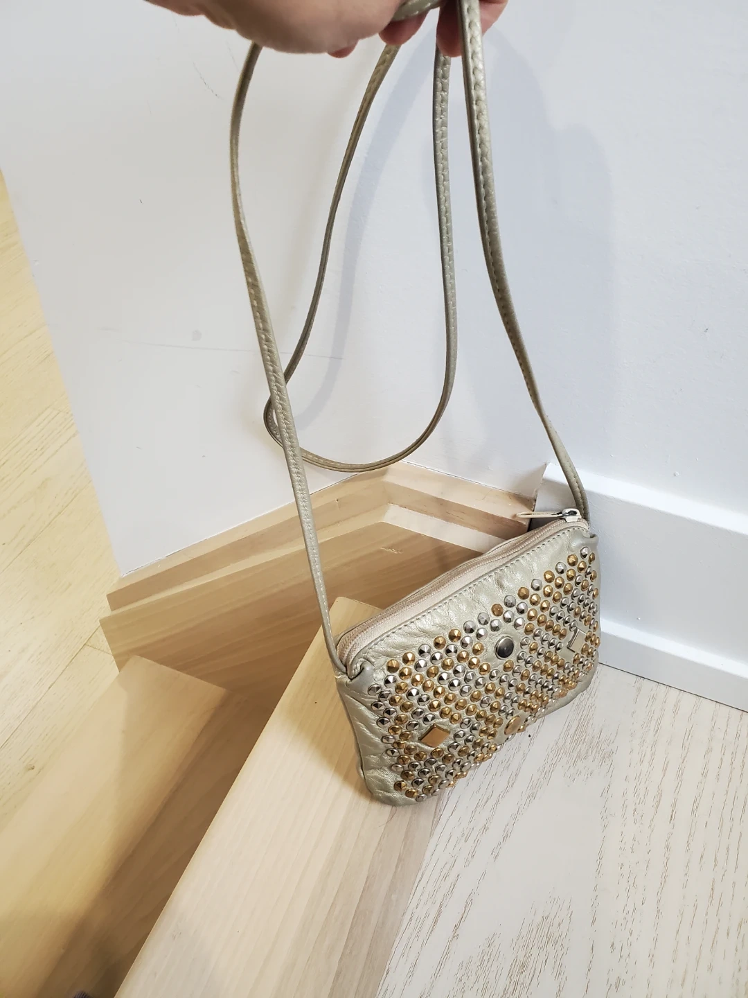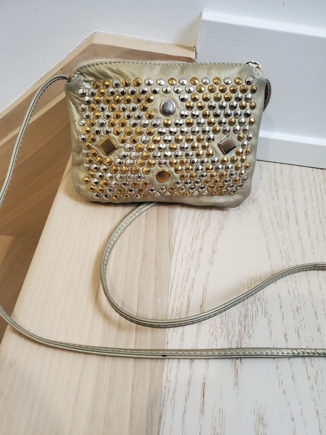 A cute leathers metallic gold crossbody bag with silver and gold studs. It's in great condition, fairly clean in the inside, and ready for a new owner!