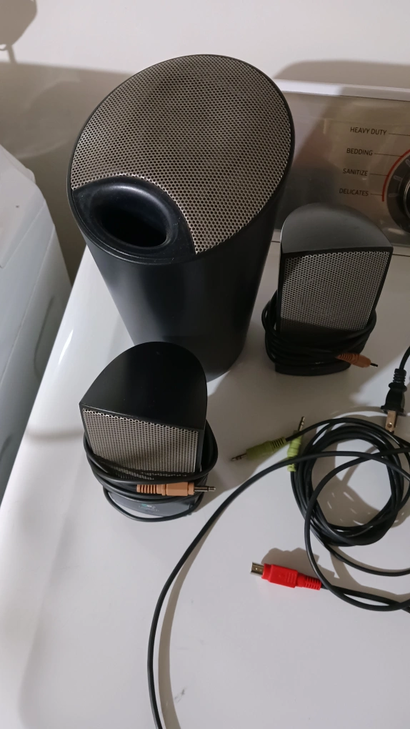 Speakers, with a subwoofer, along with cables and input jacks. Black in colour, with metal mesh speaker covers. A great way to listen to your favorite music.