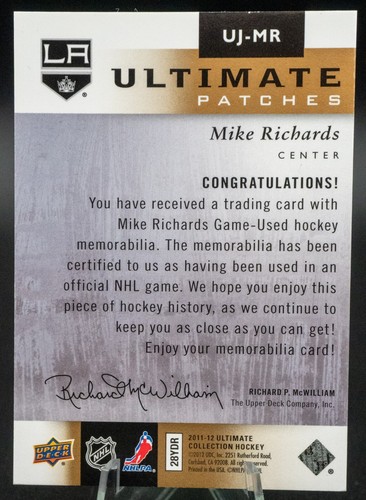 Mike Richards Dual Patch, numbered 32/35, #UJ-MR. Cards are shipped in a penny sleeve and top-loader. Feel free to message if you have any questions!