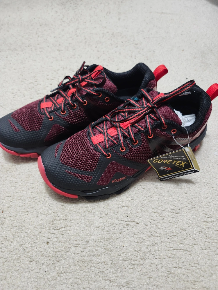 These Merrell trail running shoes are red and black. They feature Gore-Tex for waterproof protection and have a durable sole with good grip. The FlexConnect technology offers enhanced stability and natural foot movement.