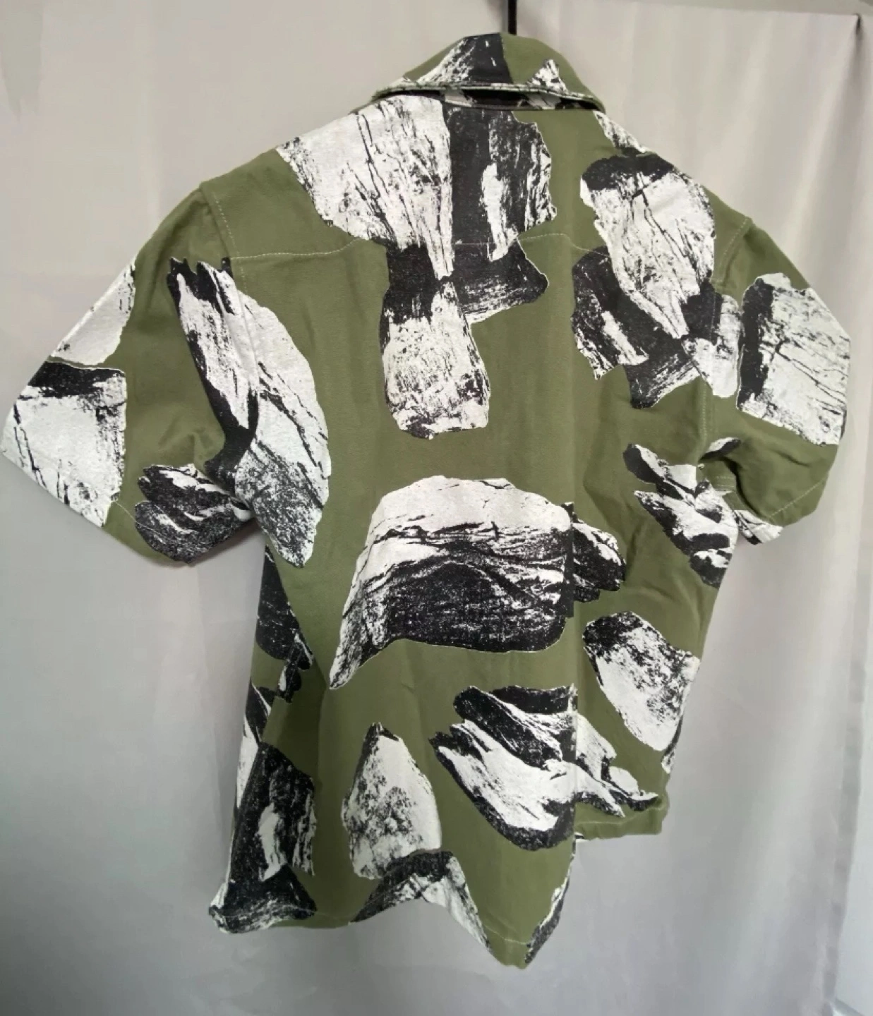 Short sleeve shirt with abstract print. Green, black, and white colours. Zip-up.