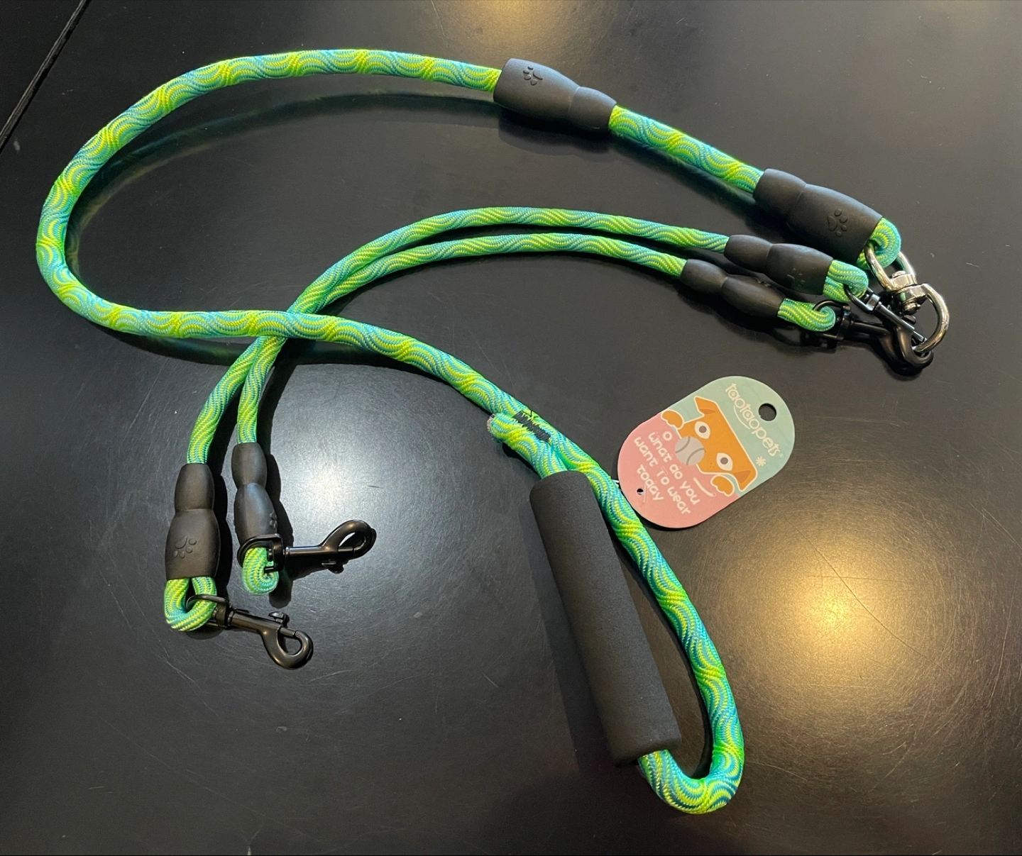 I'm selling a brand new TaoTronics Pets dog leash coupler! It's green and blue, perfect for walking two dogs at once. It has a comfortable black foam handle.
