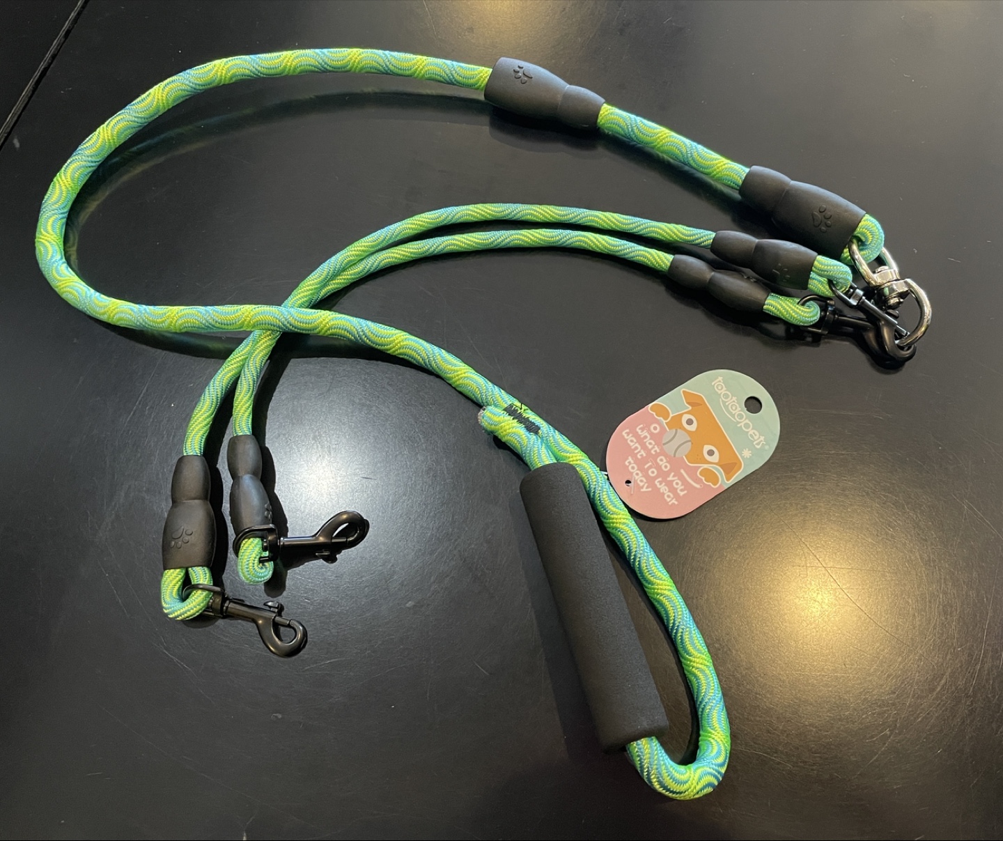 I'm selling a brand new TaoTronics Pets dog leash coupler! It's green and blue, perfect for walking two dogs at once. It has a comfortable black foam handle.