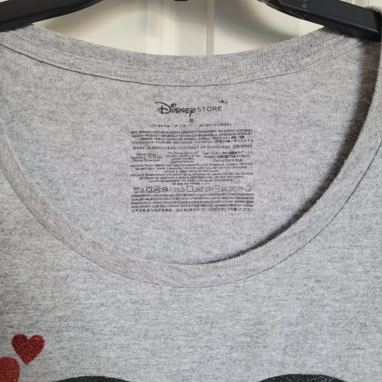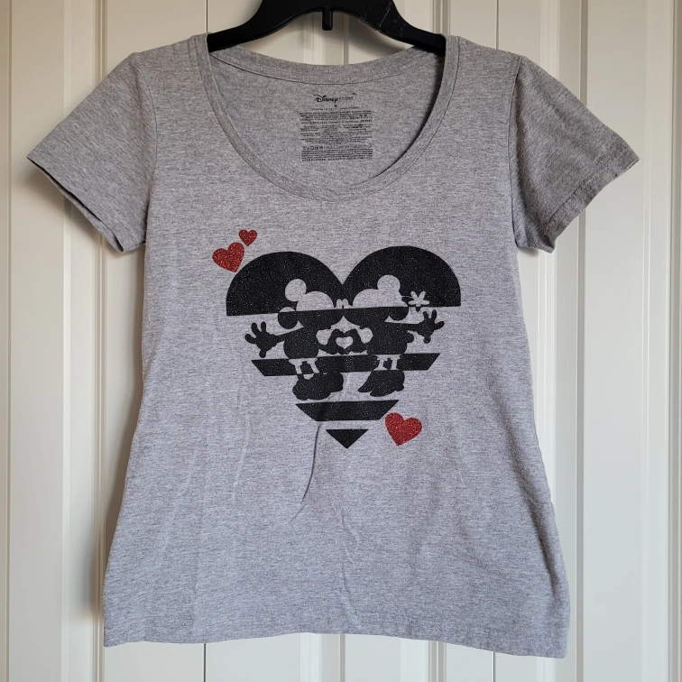 Grey short sleeve t-shirt. Features a Minnie and Mickey Mouse design in the shape of a heart. Red glitter hearts accent the design. Women's size small. Like new condition.