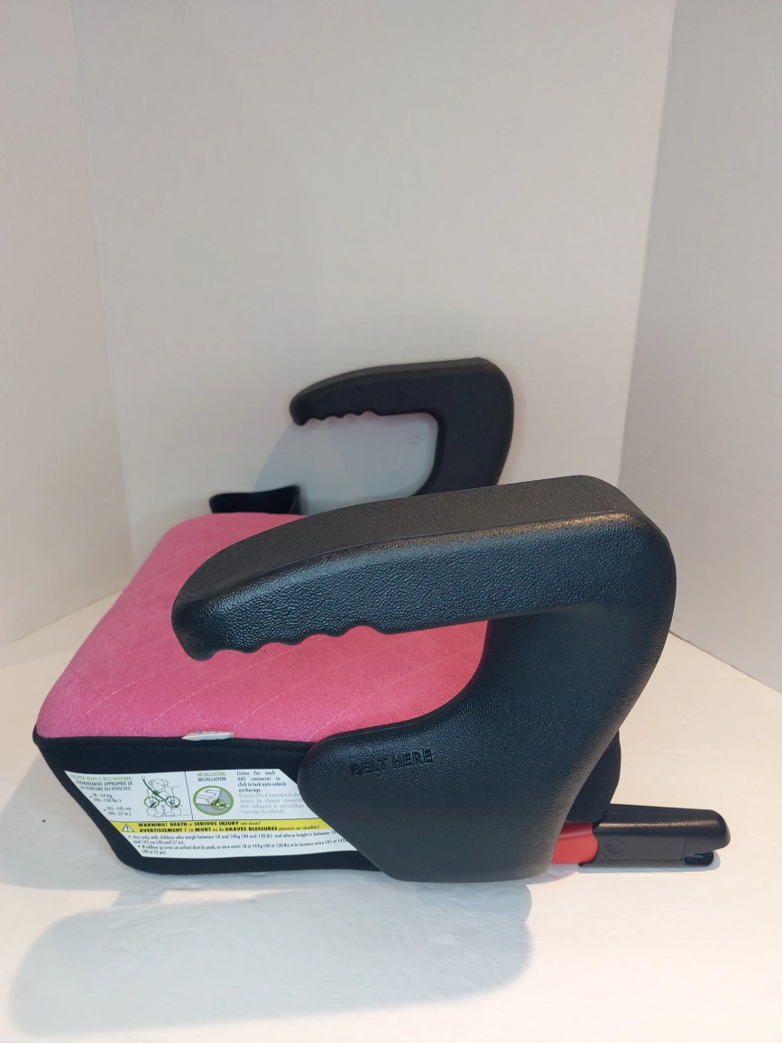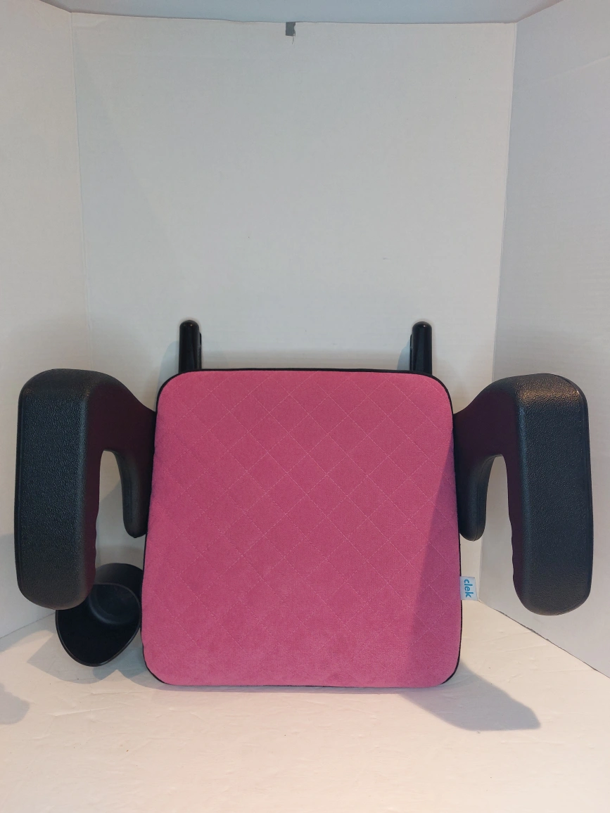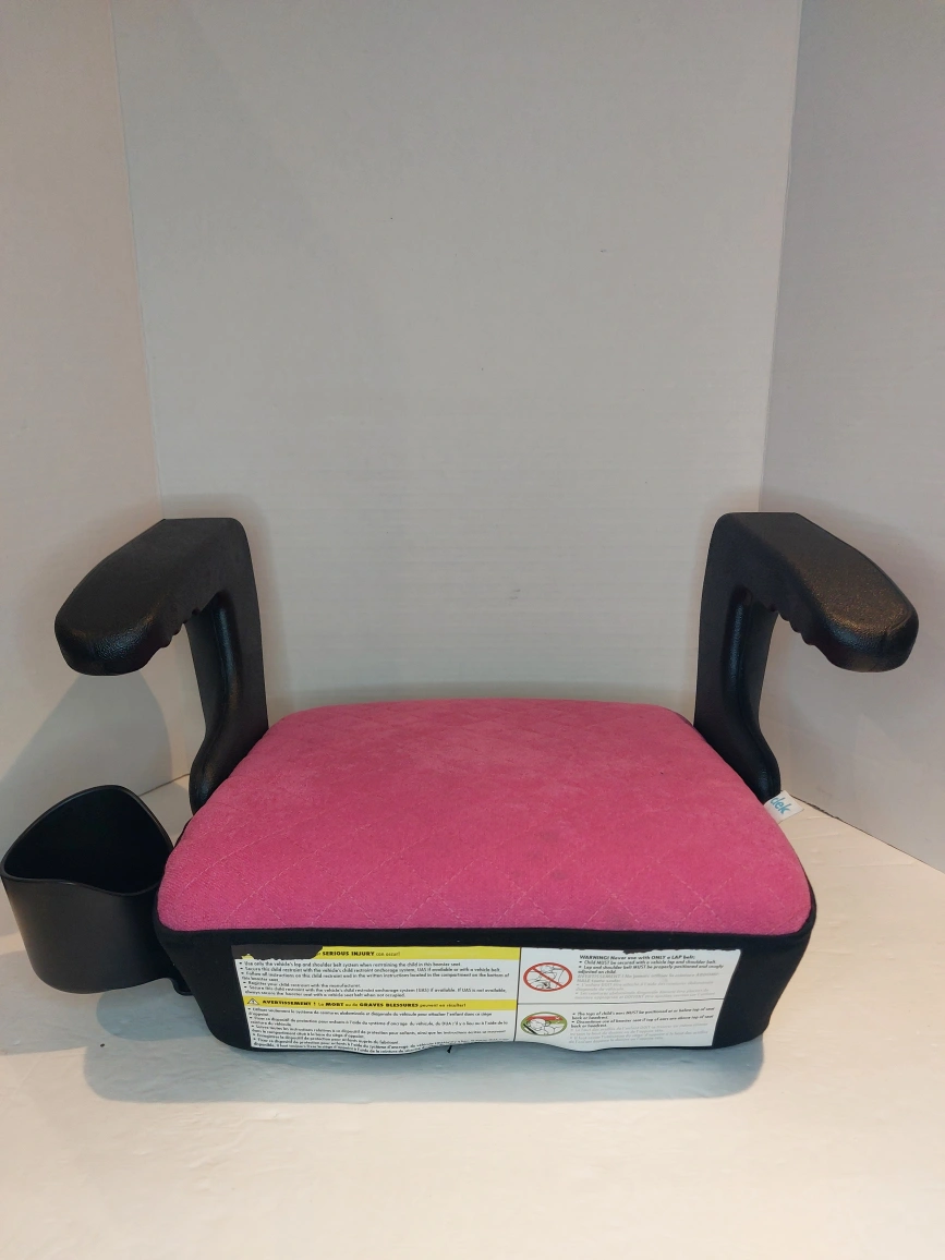 Pink booster seat with cup holder. Black armrests with adjustable height.