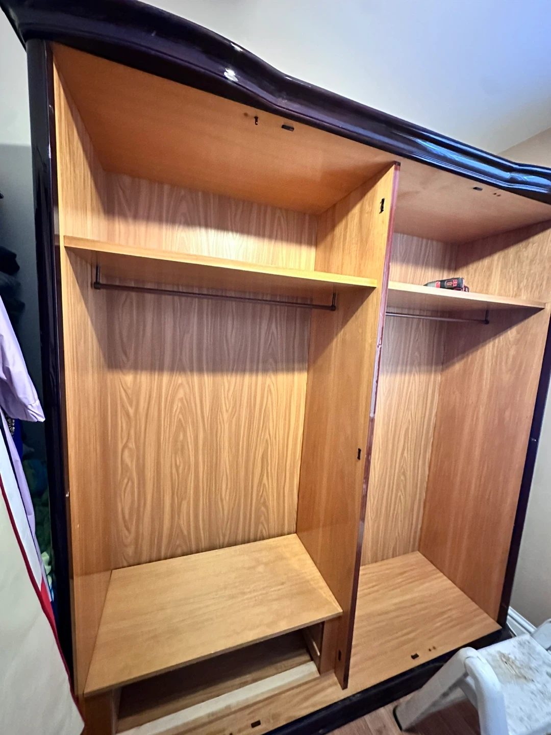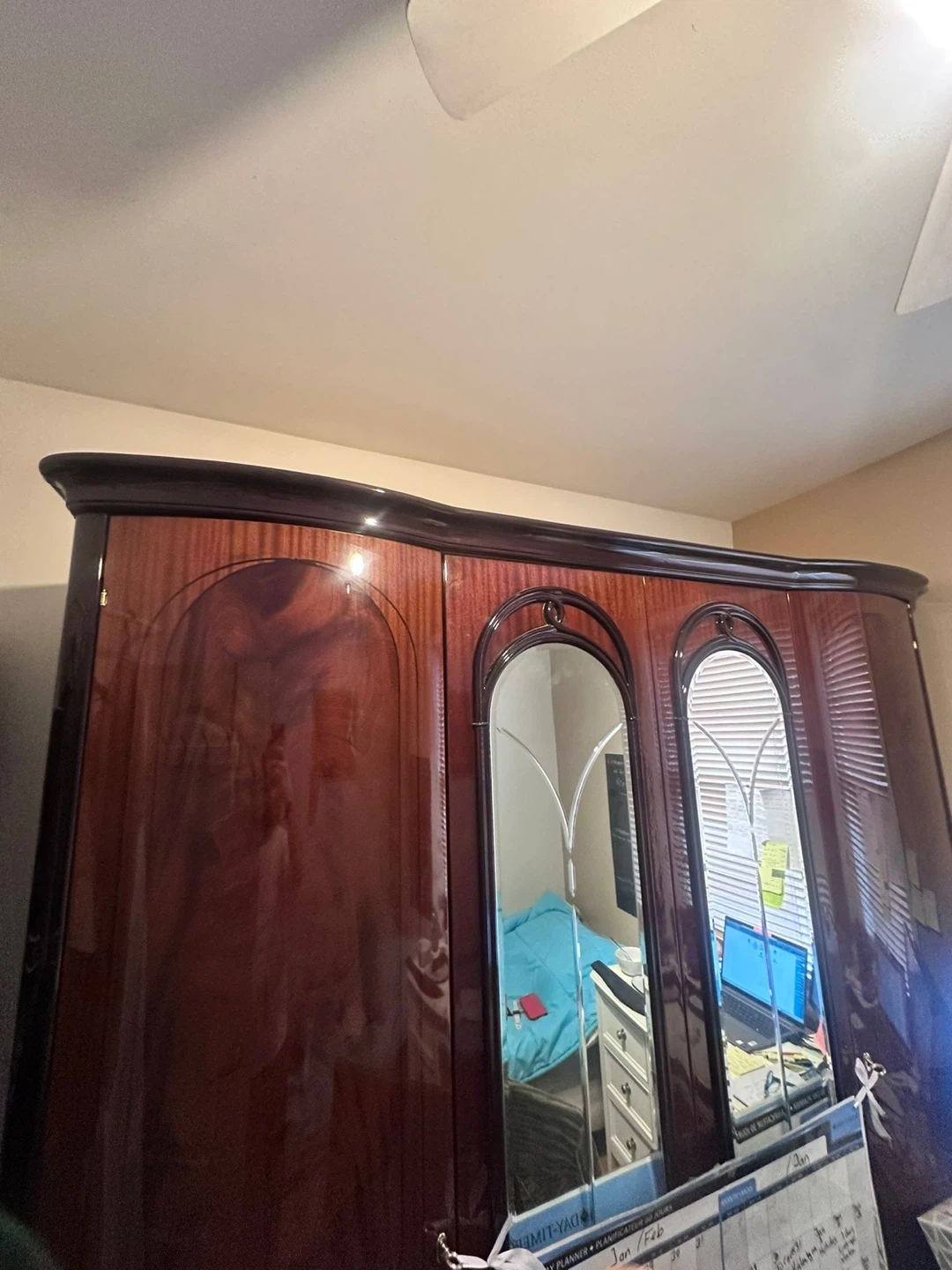 A beautiful dark wood armoire with mirrored doors. It's a spacious piece with shelving and hanging space. This armoire would be excellent for storing clothes and accessories. Very well built great closet had it for 20 years not one issue
