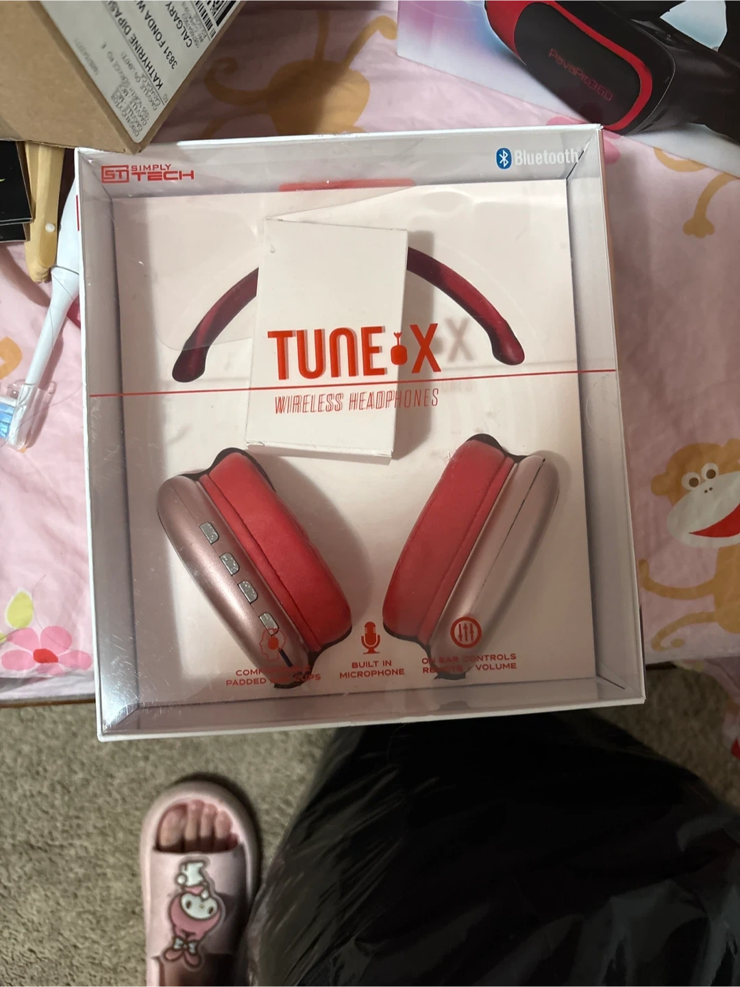 Selling a brand new Simply Tech Tune-XX wireless headphones! It comes with comfortable padded cups, a built-in microphone, and on-ear volume controls. The headphones are red and come in the original box
