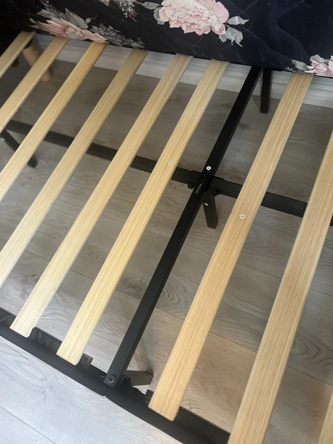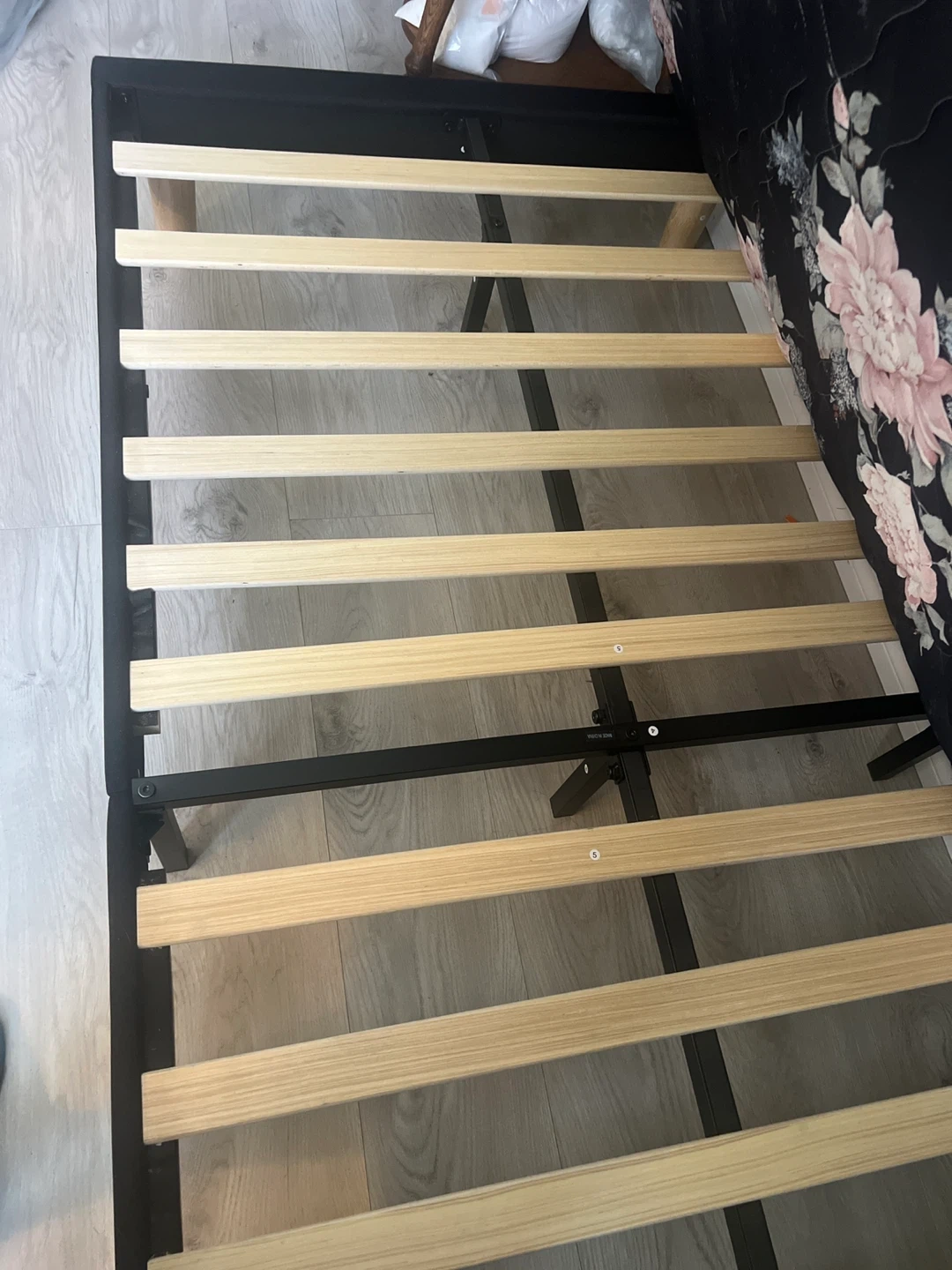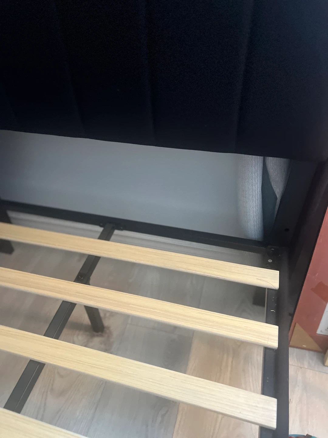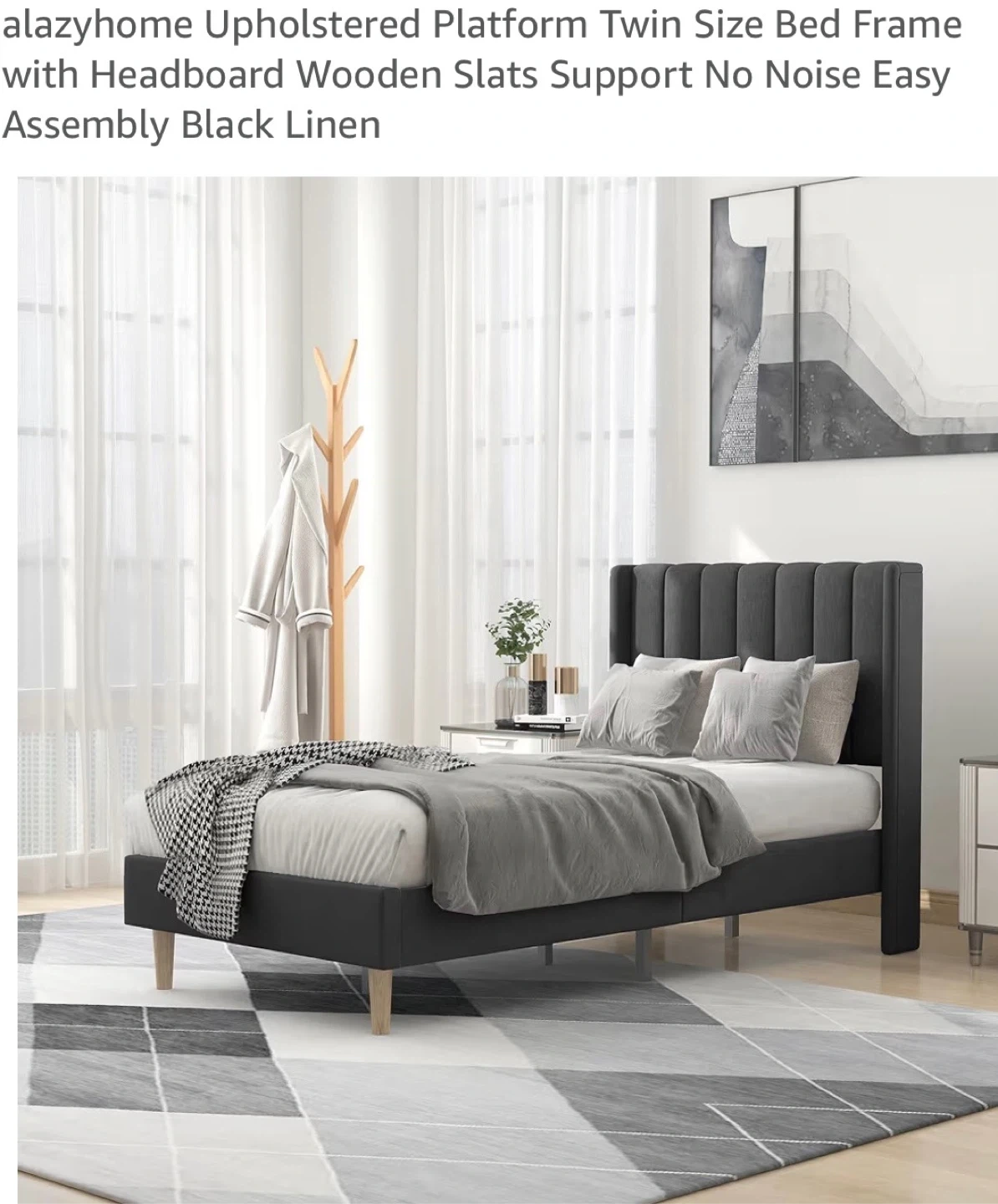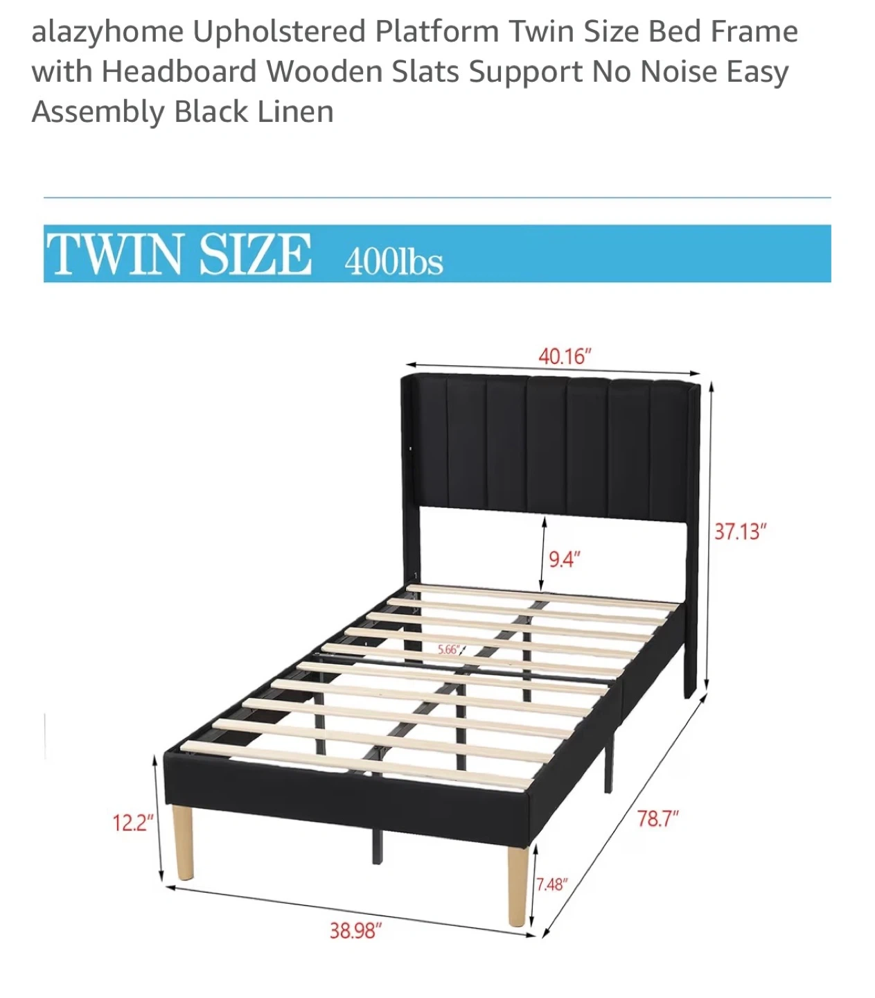 This is a twin size platform bed frame and mattress upholstered in black linen. It features wooden slats for support and a headboard. It's easy to assemble and designed for no noise.
