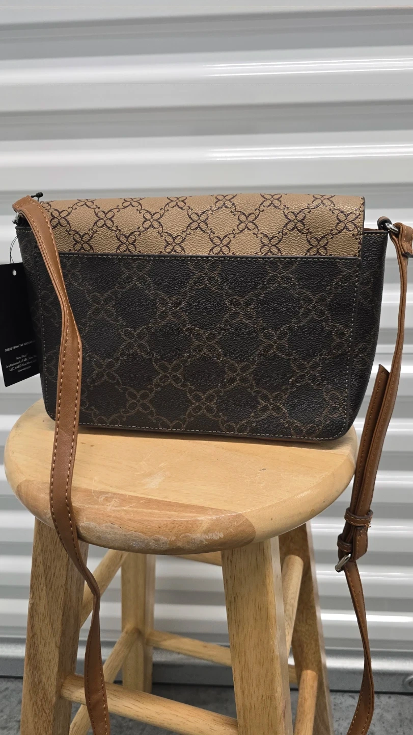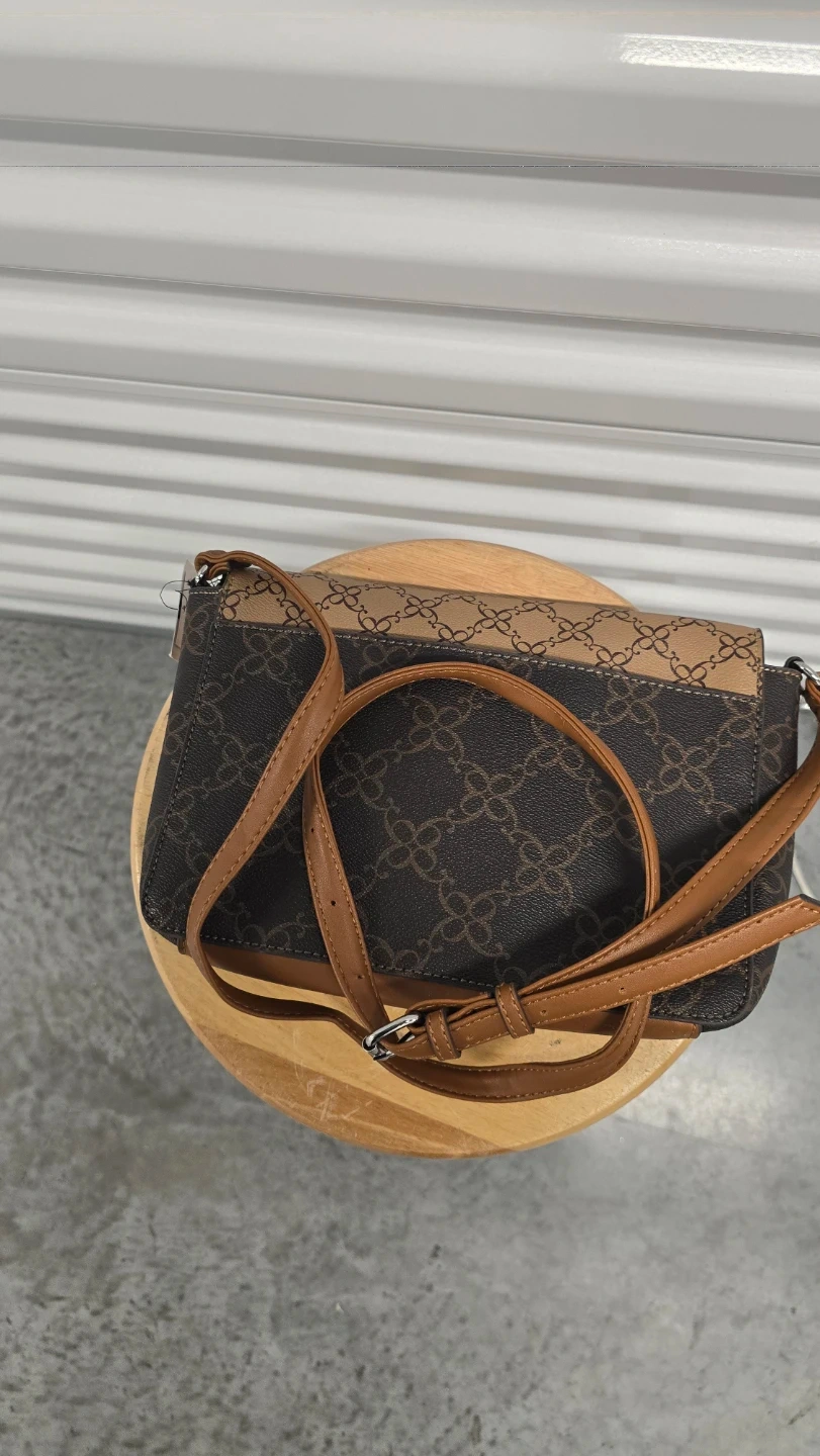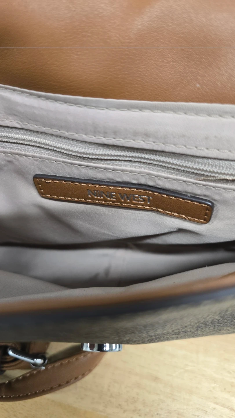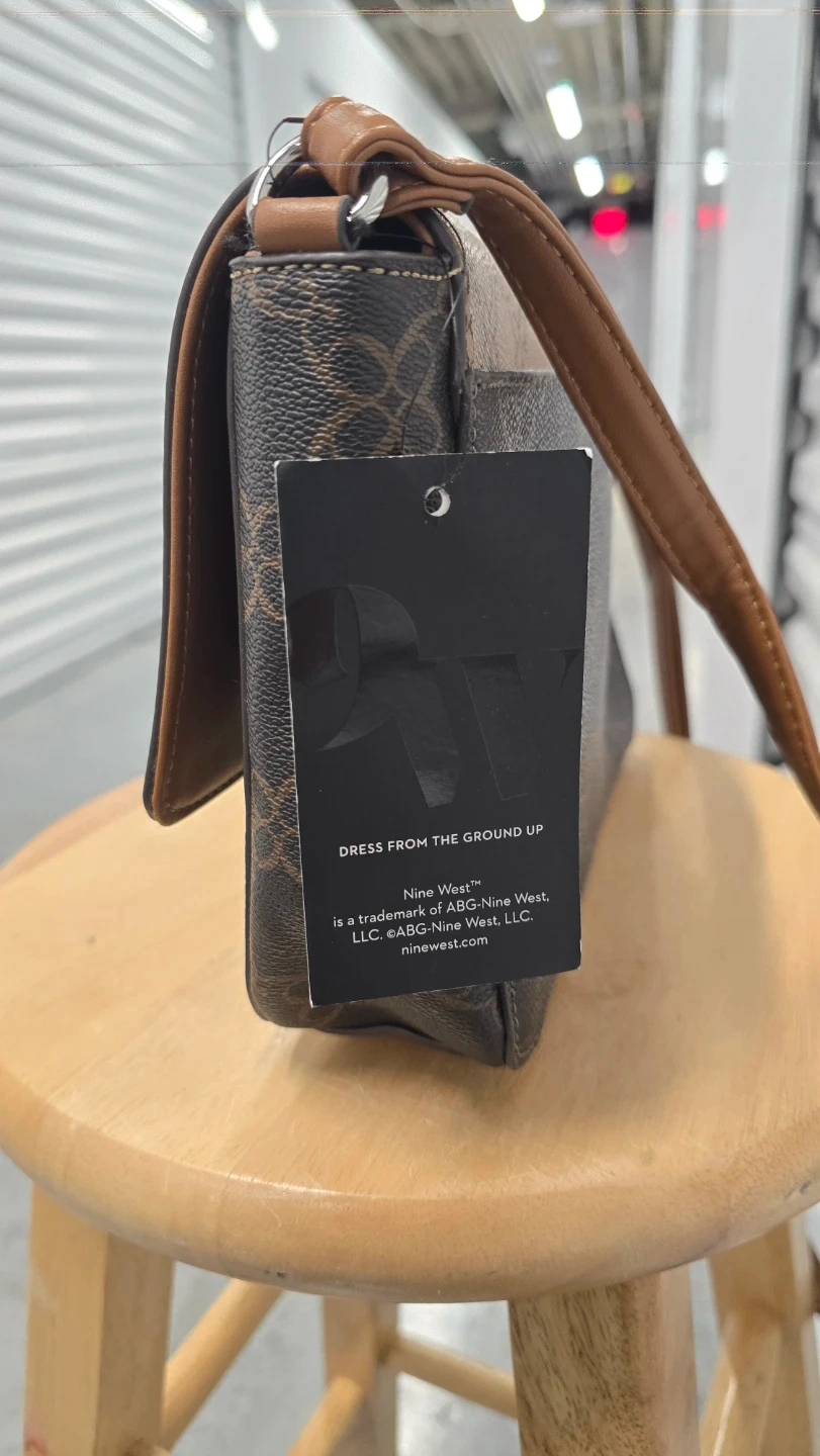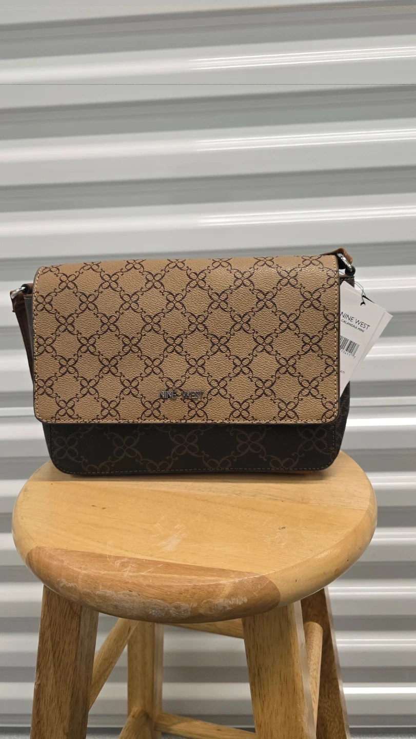 This is a Nine West crossbody bag with a brown and tan pattern. It has an adjustable shoulder strap and a magnetic snap closure. The interior is lined with a brown fabric and has a zippered pocket