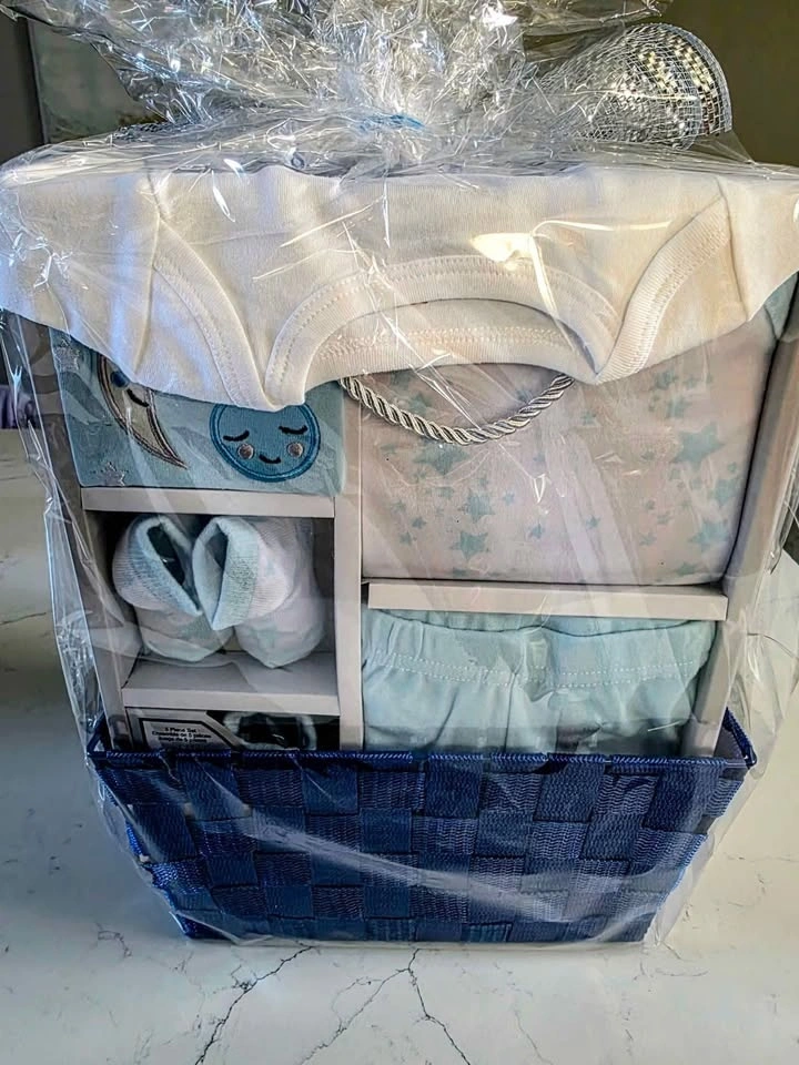 Beautiful baby gift basket, brand new and still wrapped, ready to gift. Perfect for a baby shower, newborn arrival, or welcome-home gift.