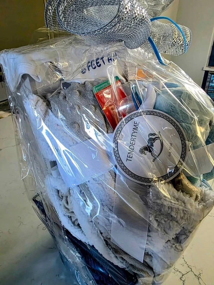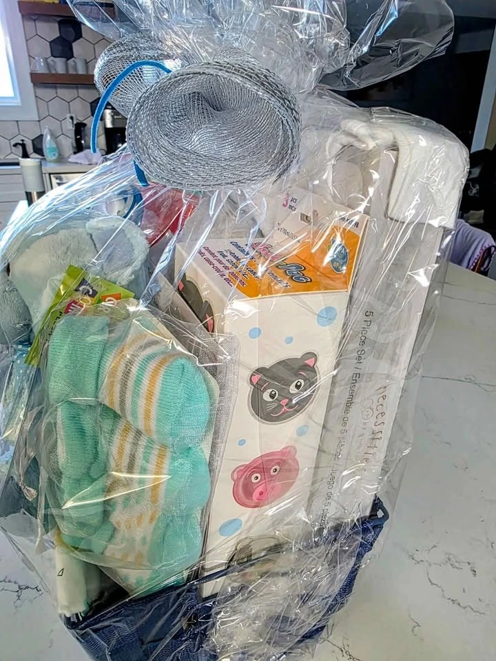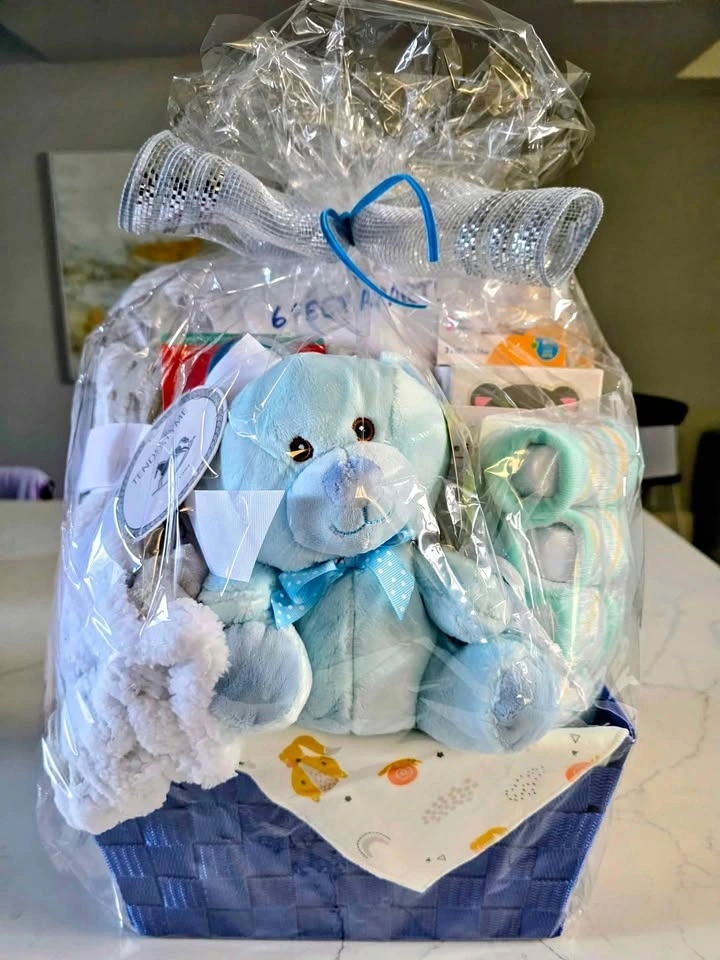 Beautiful baby gift basket, brand new and still wrapped, ready to gift. Perfect for a baby shower, newborn arrival, or welcome-home gift.