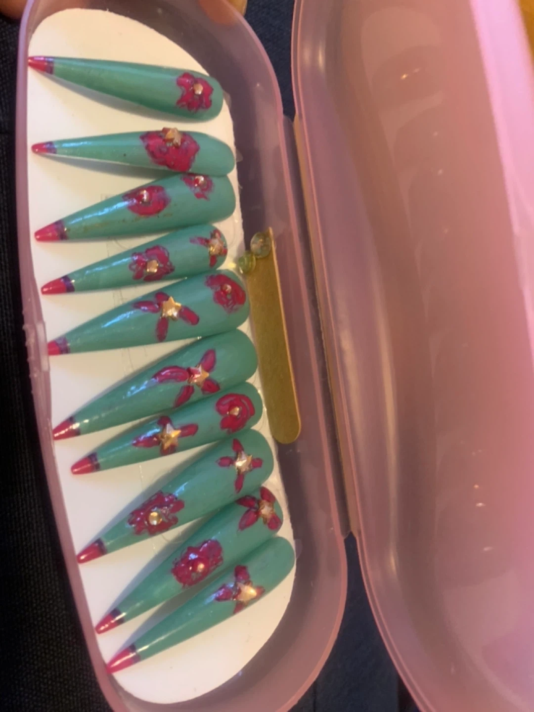 Three sets of press-on nails. Each set features unique designs with vibrant colours and embellishments. Comes with case, 2 extra sets of glue and emery board. $9