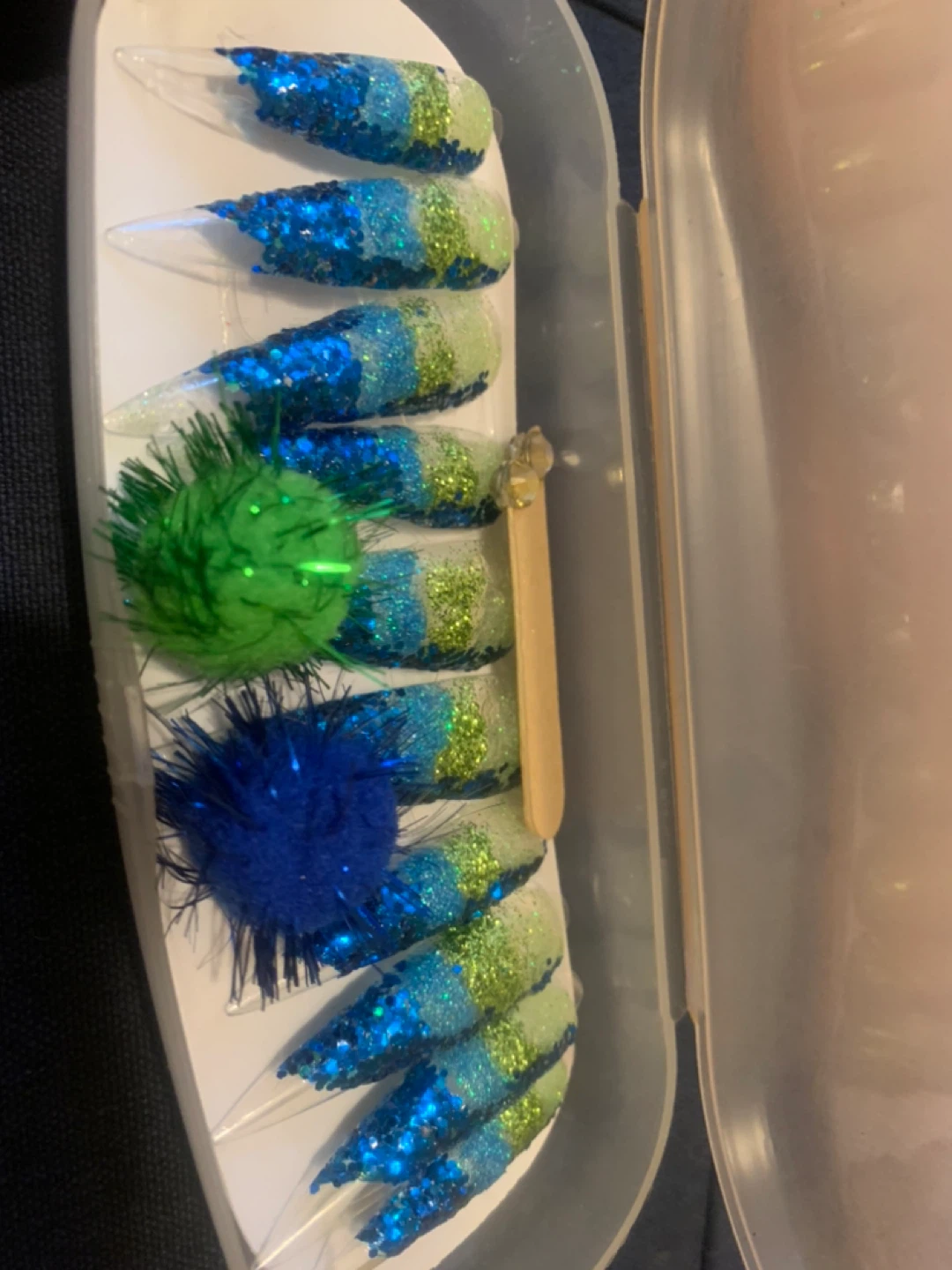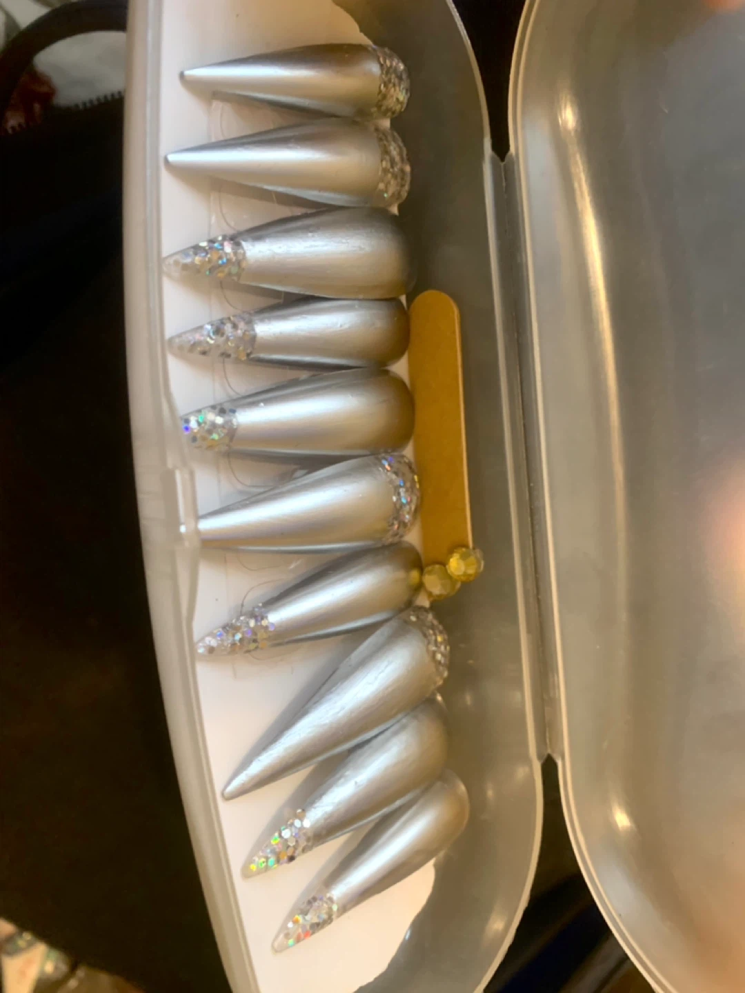 Three sets of press-on nails. Each set features unique designs with vibrant colours and embellishments. Comes with case, 2 extra sets of glue and emery board. $9