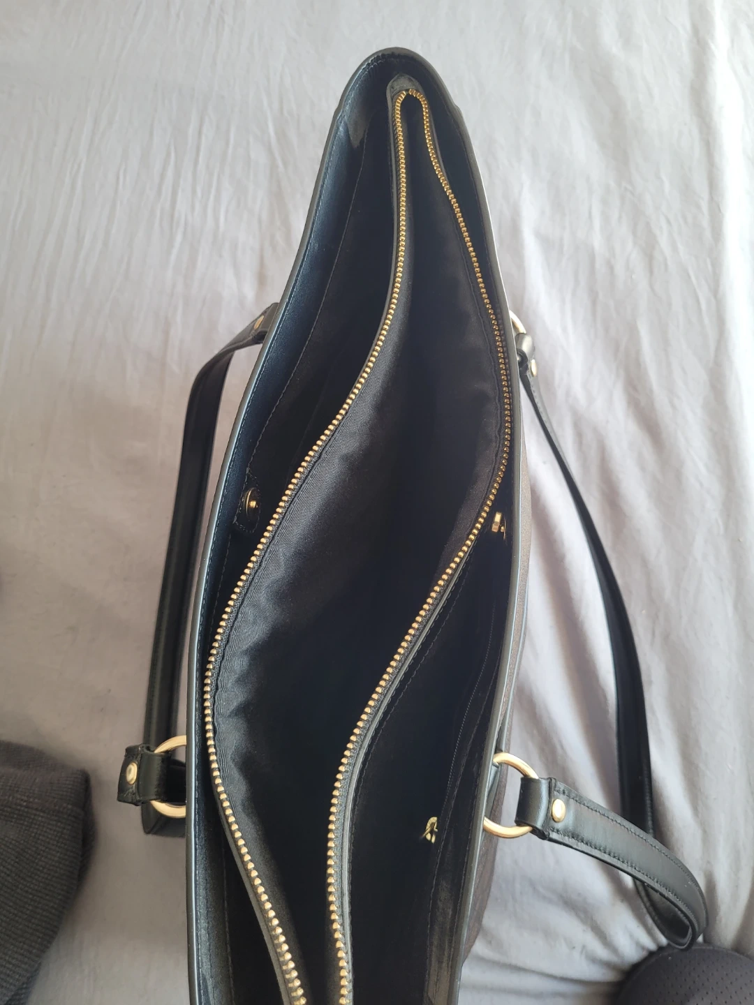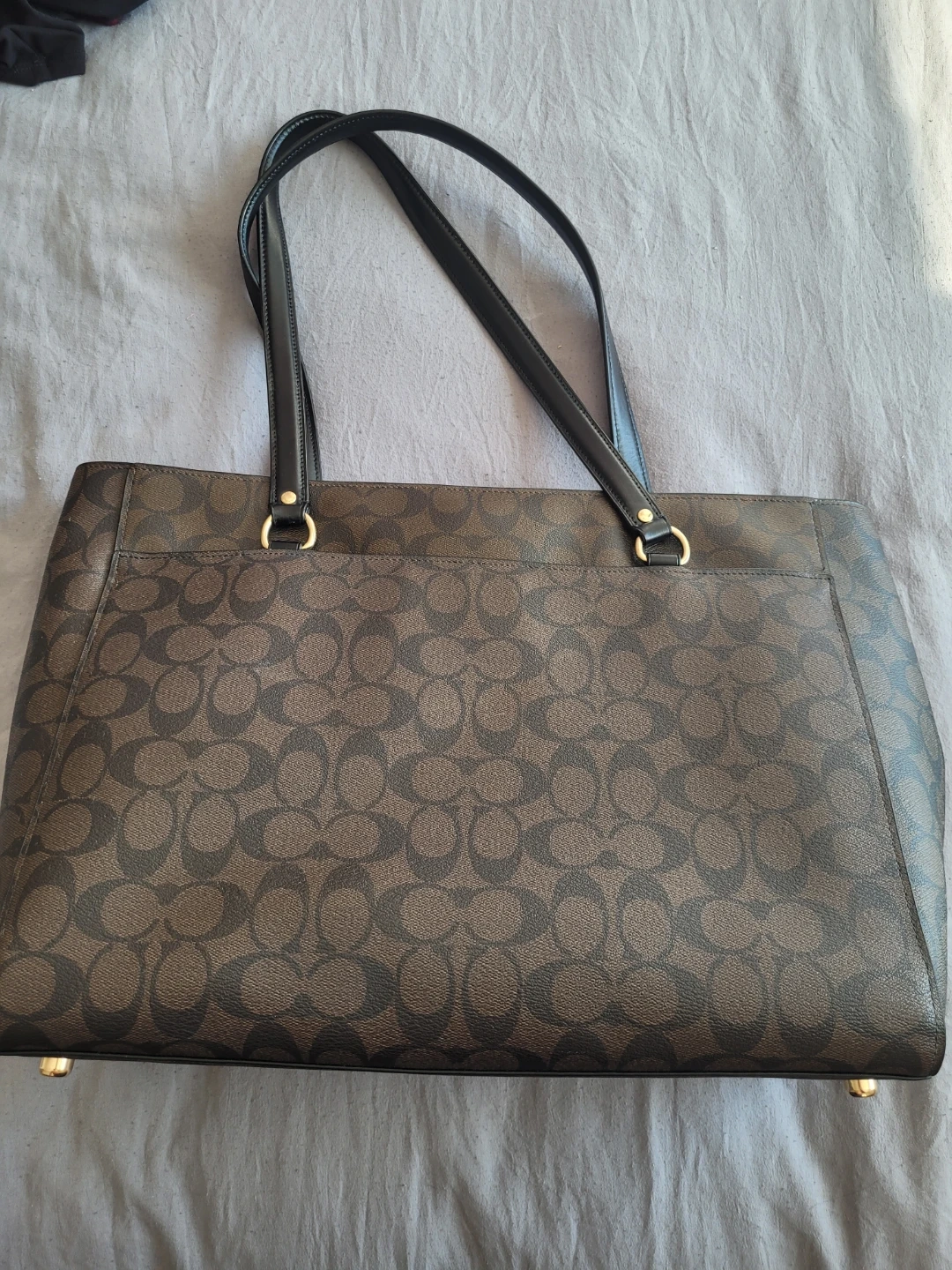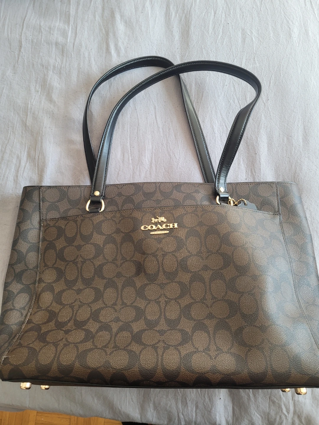 This is a classic Coach tote bag. It features the signature Coach monogram print and black leather accents. The interior has multiple compartments for organization. This bag is perfect for everyday use!