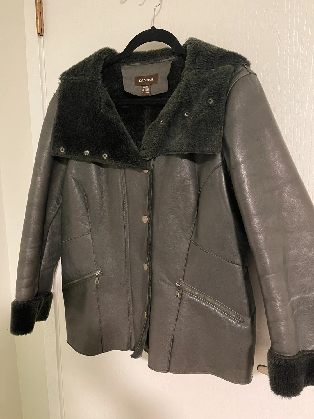 Danier women's jacket in a stylish grey colour. It features a cozy fur trim and lining for warmth. Includes two zippered pockets. All snaps and zippers work. Genuine Danier leather with faux fur lining. Ladies aviator/motorcycle style jacket