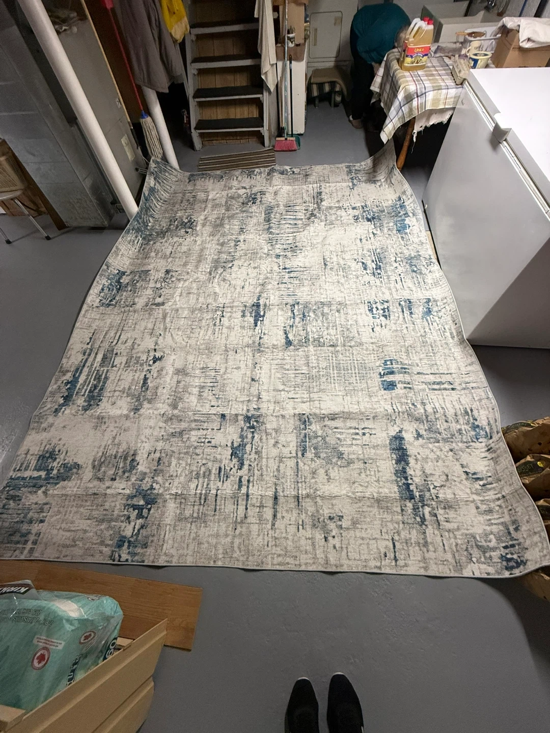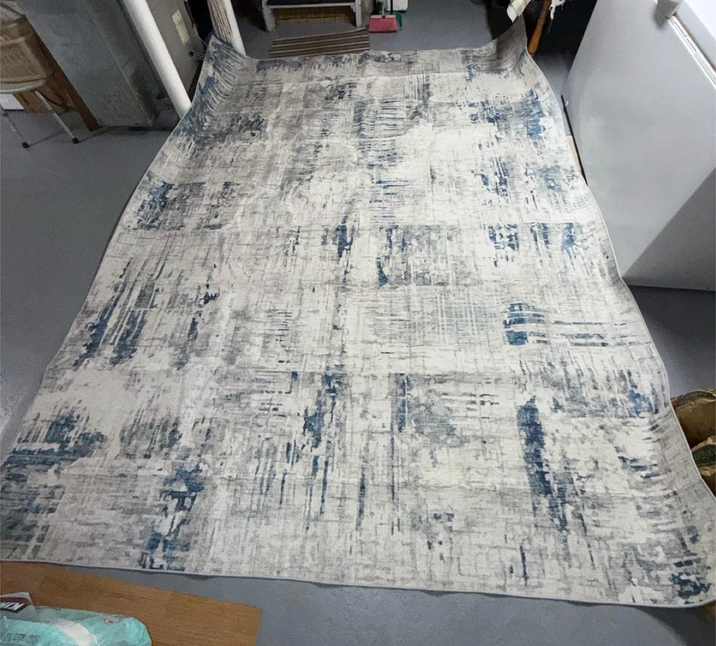 This is a large area rug featuring a modern abstract design in grey, white, and blue tones. It's made from a soft, durable fabric perfect for adding style to any room. Its generous size makes it suitable for living rooms or bedrooms. Machine washable.