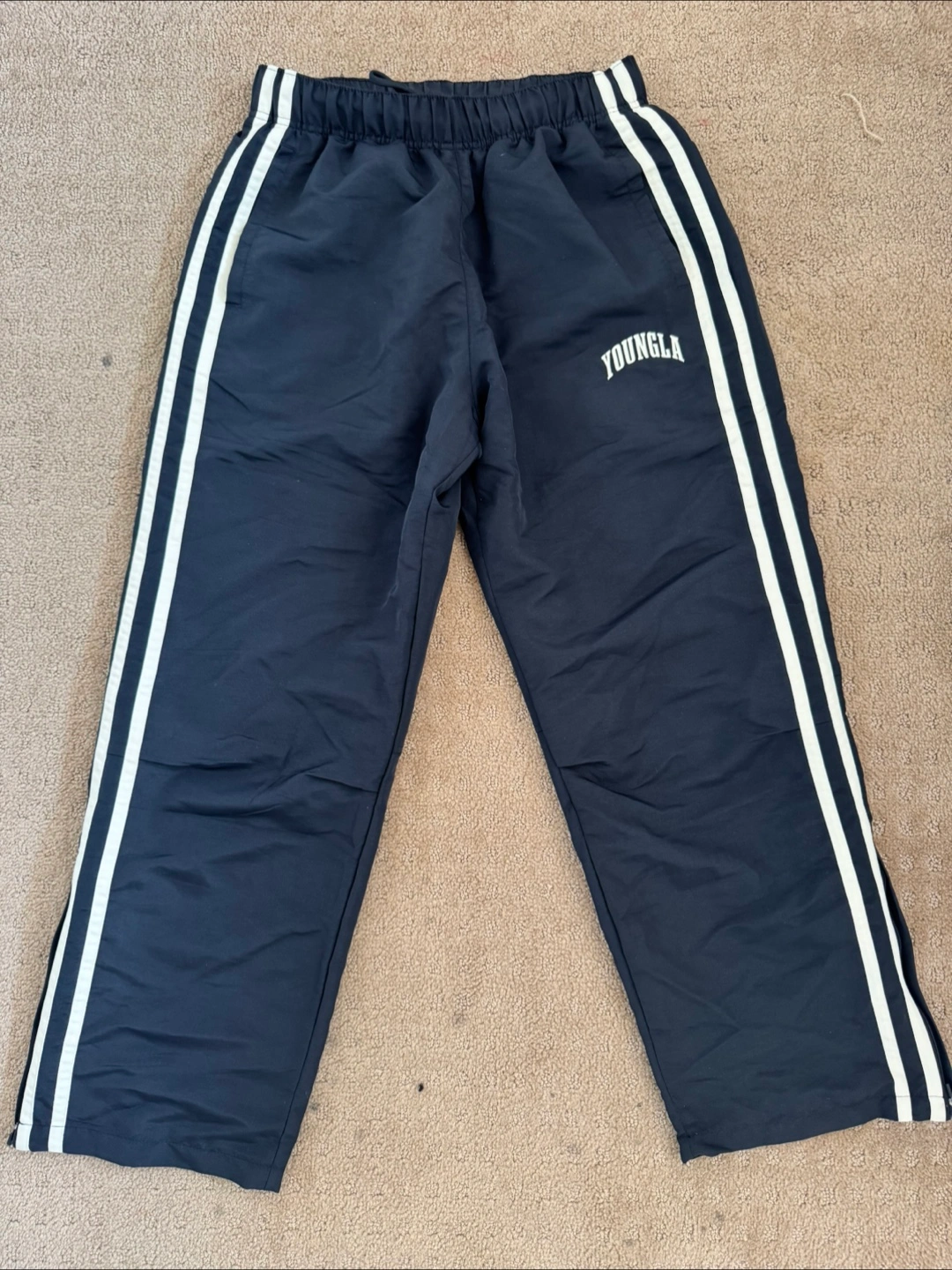 These YOUNGLA track pants are in great condition! They're a size medium and feature a stylish design with white stripes down the sides. Perfect for workouts or just lounging around the house!