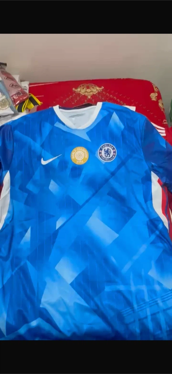 This is a Chelsea FC soccer jersey made by Nike. It's blue with a geometric pattern. Features the FIFA World Champions badge.