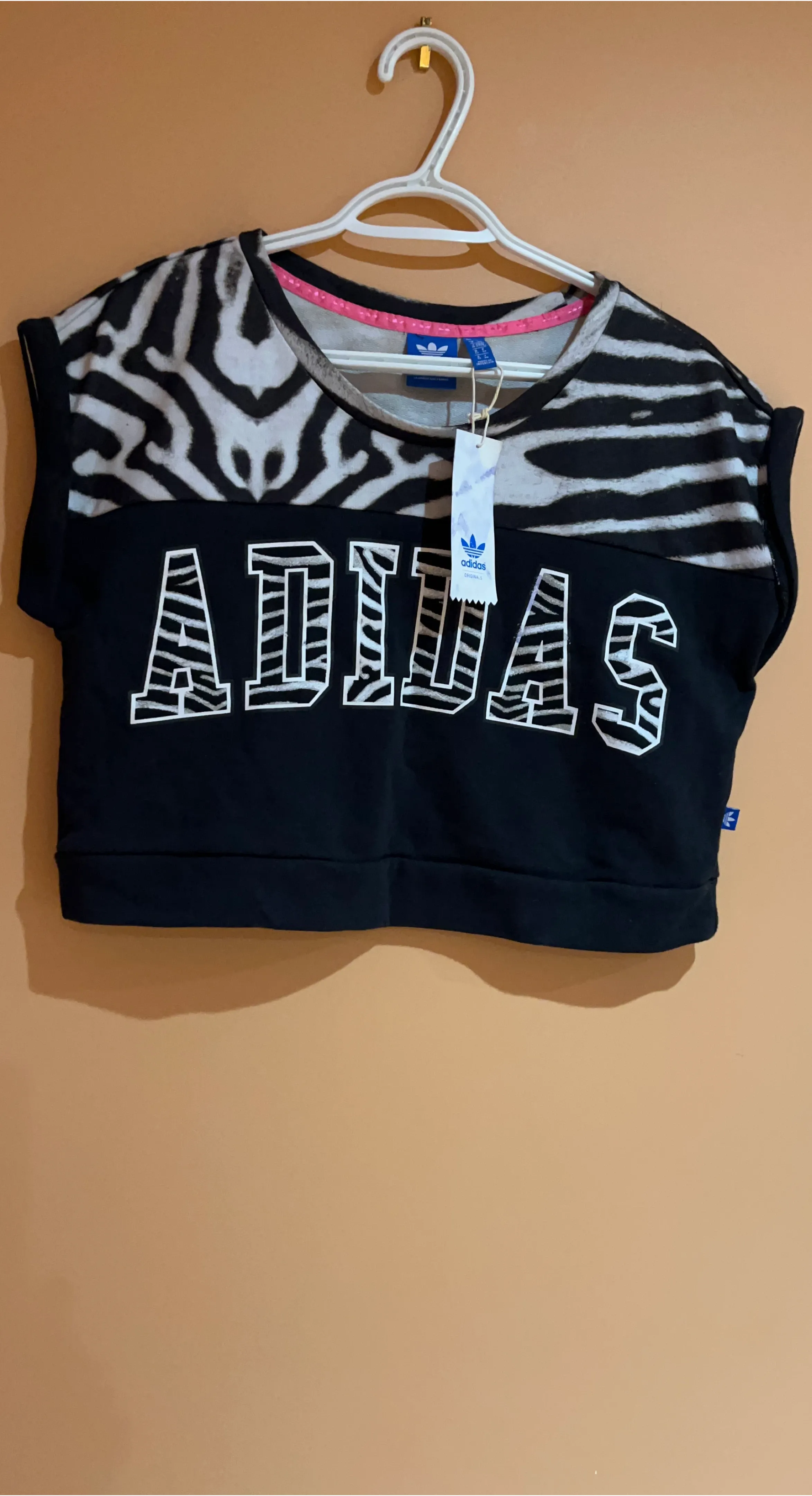 Adidas cropped top with a cool zebra print! It's in great condition and ready for a new home. Perfect for a casual day out or a workout session. The Adidas logo is prominently displayed, making it a stylish and sporty addition to your wardrobe