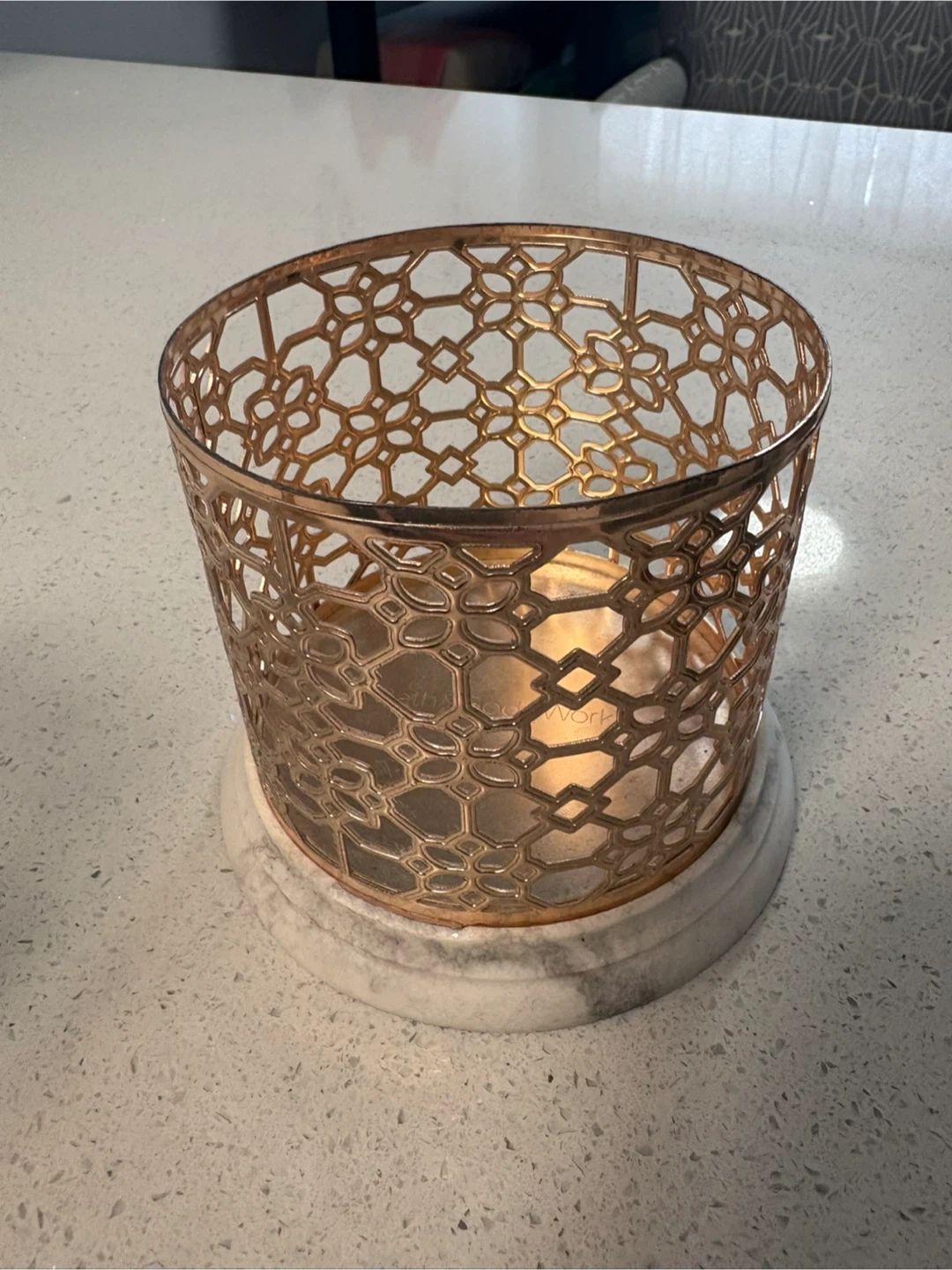 Selling a Bath & Body Works candle holder. It features a decorative gold metal design on top of a marble-like base. Perfect for adding a touch of elegance to any room!